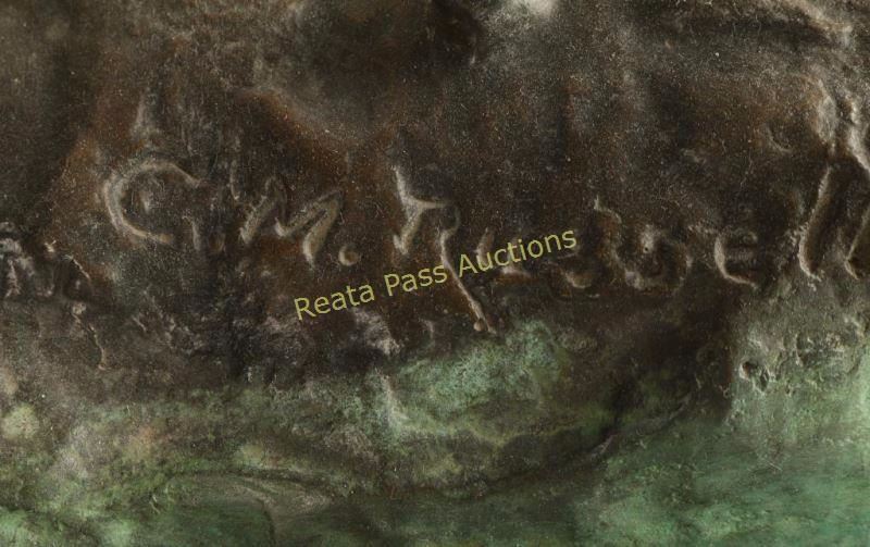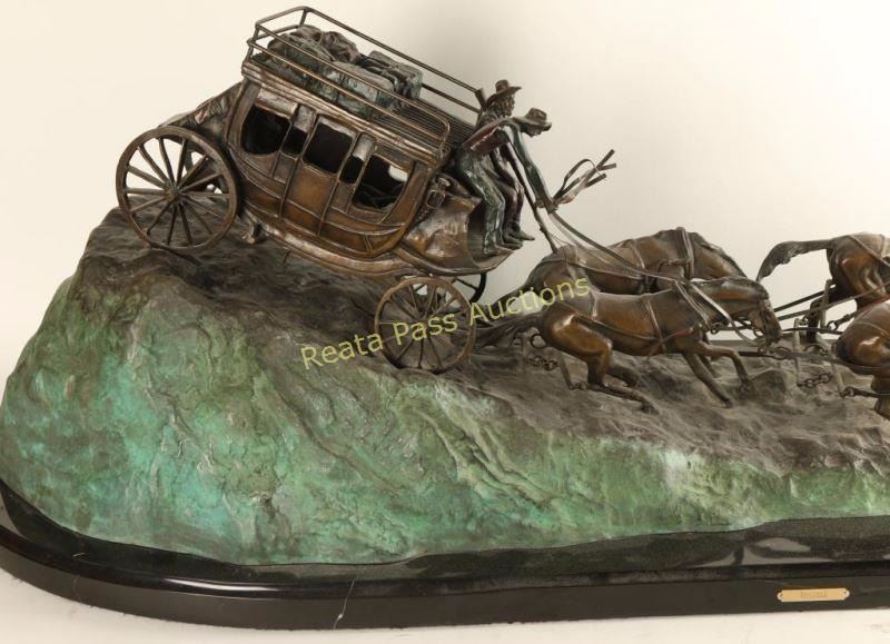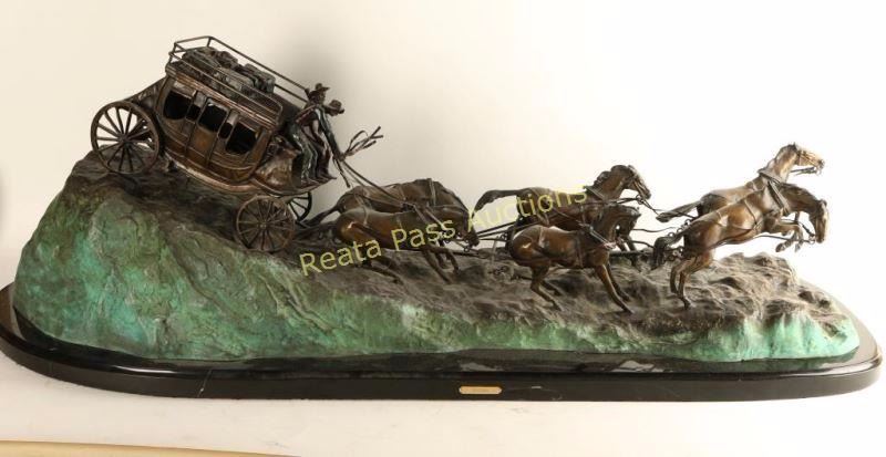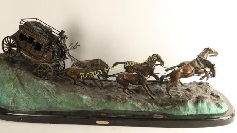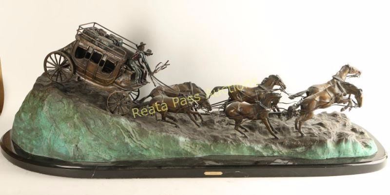 Famous Western artist C.M. Russell depicting stagecoach and a team of horses with a deep brown and green patina finish on marble base. Signed CM Russell. Measures 47"x21" restrike bronze but very high quality. From the Larry Howard Estate.