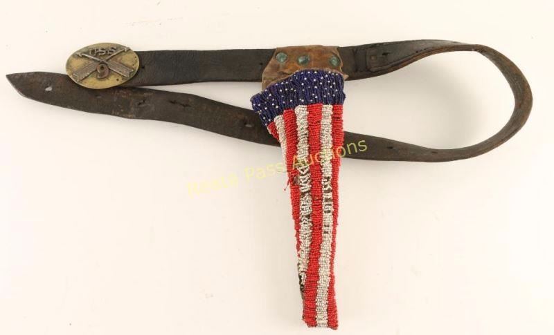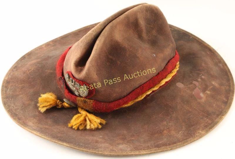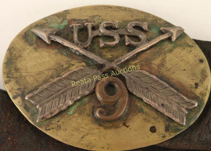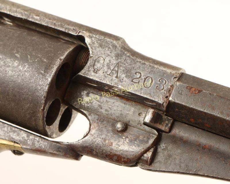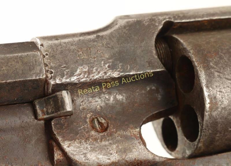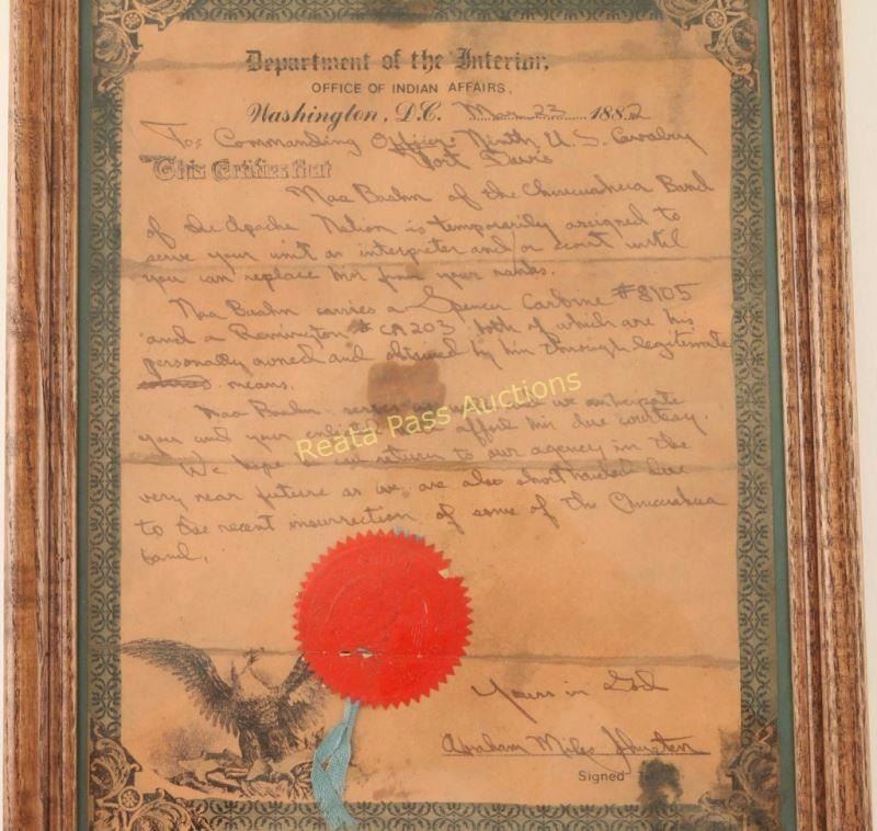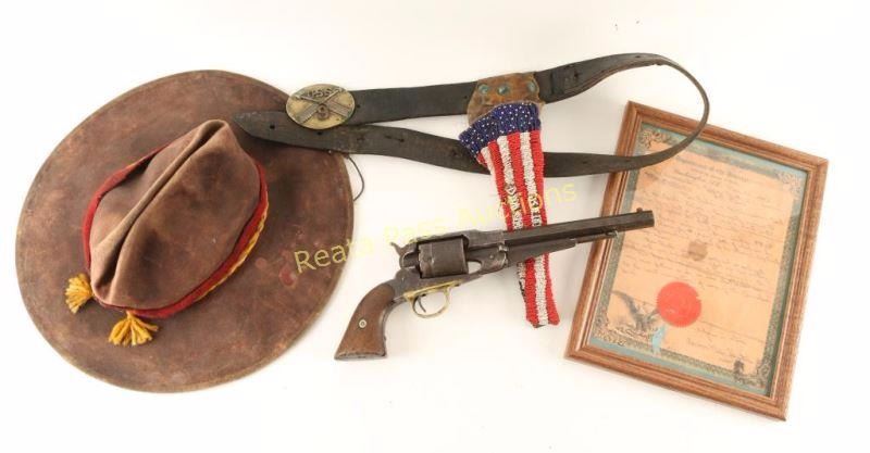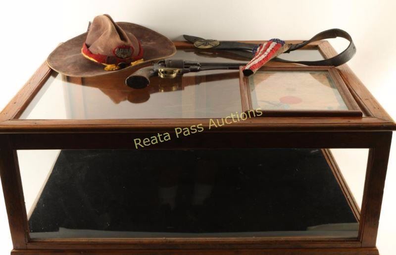 Early percussion revolver converted to .44 centerfire cartridge. Stamped 'BIA" and 'C.A. 203' in large block letters on the frame. Includes holster rig with American flag beaded holster, brass belt buckle "USS 9" and a brown felt hat with trade wool hat band and US emblem. Also included is a document from the Department of the Interior Office of Indian Affairs, Washington, D.C. dated March 23, 1882 "To commanding officer, U.S. Cavalry, Fort Davis NAA BAAHN of the Chihuahua Band of the Apache Nation is temporarily assigned to serve your unit an interpreter and/or scout until you can replace him from your ranks NAA BAAHN carries a Spencer carbine #8105 and a Remington #CA203 both of which are personally owned and obtained by him through legitimate means. NAA BAAHN serves us well and we anticipate you and your enlisted will afford him due courtesy. We hope he returns to our agency in the very near future as we are also short handed due to the recent insurrection of some of the Chihuahua band. Yours in God, Abraham Miles Johnsten." Includes a red seal from the US Office. Framed behind glass. Lot does not include the Spencer mentioned in the letter. Includes antique oak showcase measures 33"x26"x13 3/4", missing one piece of glass on side. Revolver exhibits approximately 10% of it's original blued finish with a majority of the metal surfaces turned a dark grey patina with scattered surface rust. The hammer will not stay cocked, bore is very good but does have rust near the muzzle and wood grips are very good showing nail head marks on the bottoms & left panel is marked "USS". Condition is good. ***Antique Firearm***