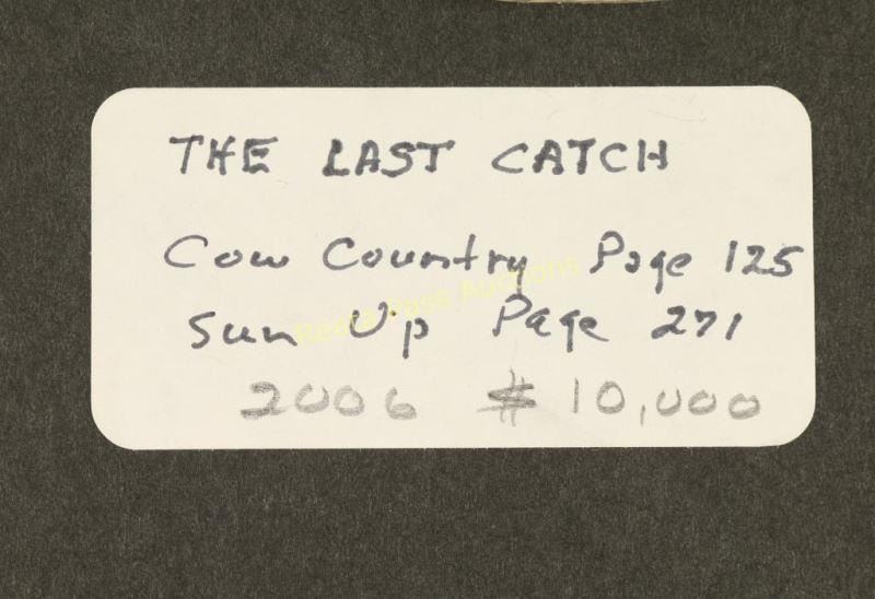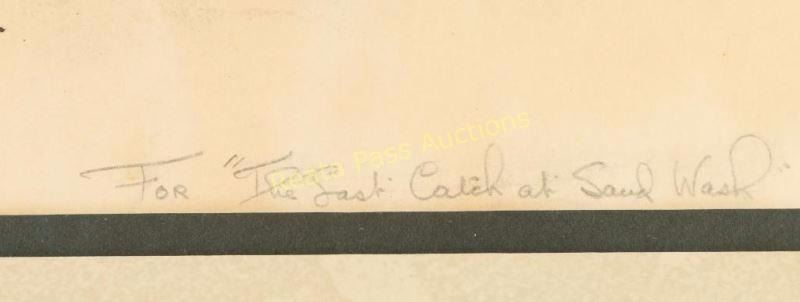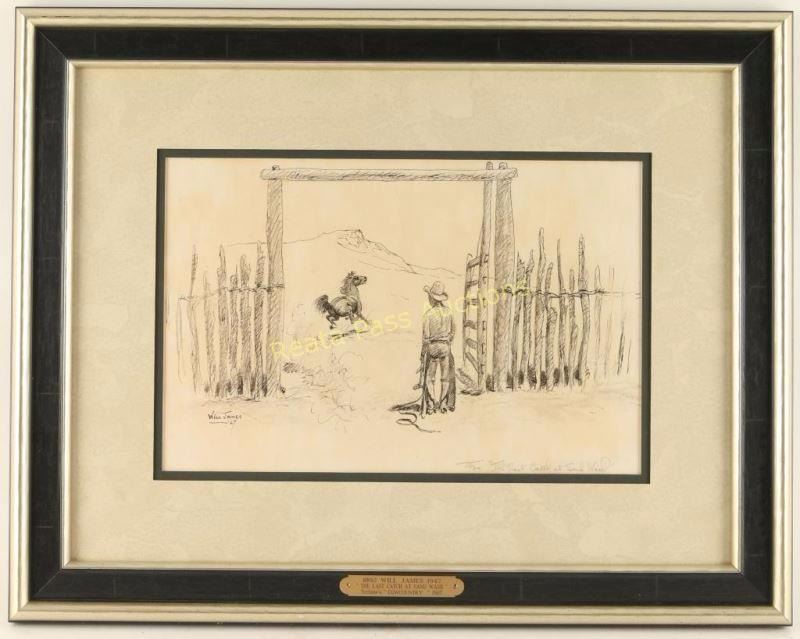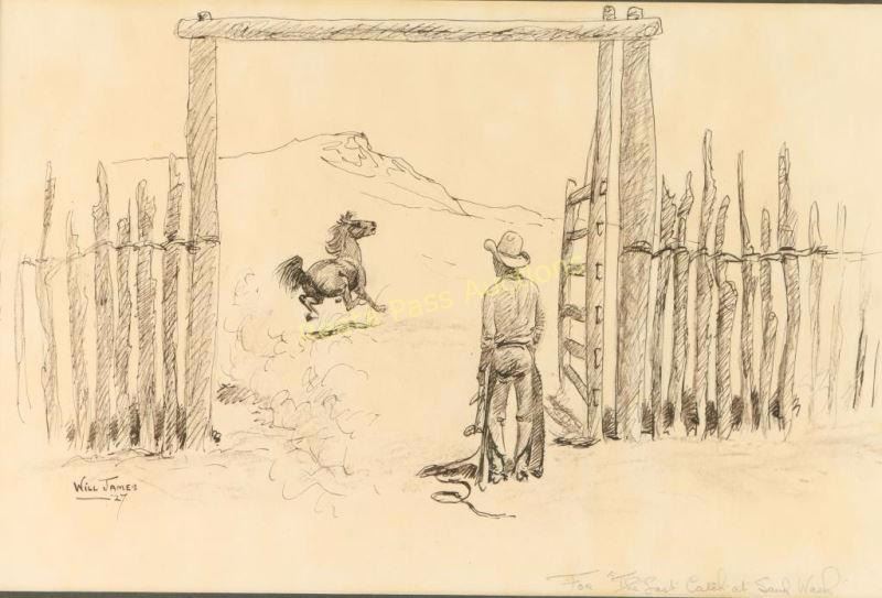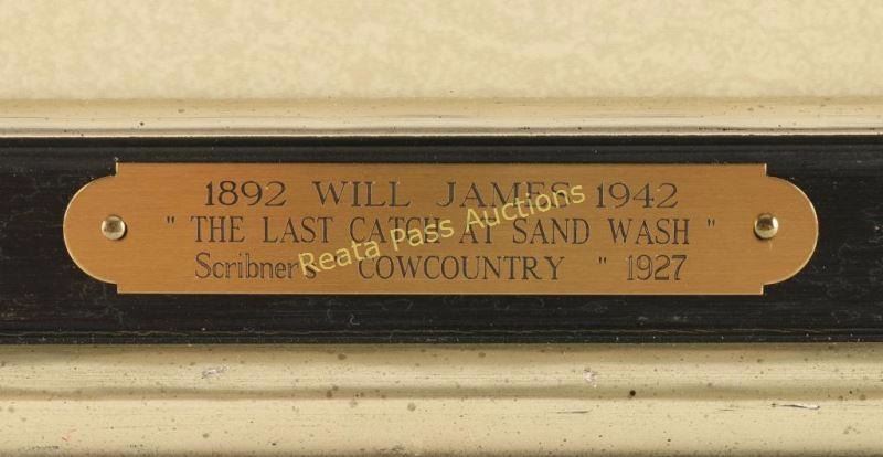 Entitled "Last Catch at the Sand Wash" signed lower left with 'For The Last Catch at Sand Wash' written lower right. Image measures 13" x 9/12" with double mat and silver and black wood frame. Brass plaque on frame reads '1892 Will James 1942, "The Last Catch At Sand Wash" Scribners Cowcountry 1927'. Will James, cowboy, cattle rustler, and beloved author and artist of the American West was born in Quebec, Canada. He came West at the age of fifteen and became a cowhand showing artistic talent from an early age, gaining a reputation for his sketches of life on the range. Between 1920 and his death in 1942 Will James wrote and illustrated more than twenty books and numerous magazine articles. The Will James Society promotes his legacy, literature, and art, and donates his books to schools and libraries throughout the United States and Canada. They also send softcover versions to military installations in the US and overseas. The society is currently located in Elko, Nevada which is also the home of the Northeastern Nevada Museum, the home of Don Frazier's collection of art works and books by Will James. From the Bill A. Gary estate Prescott, AZ.