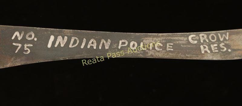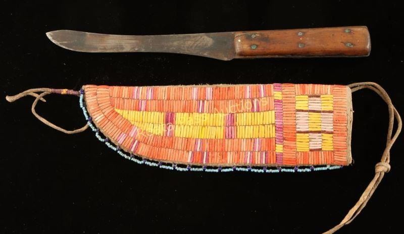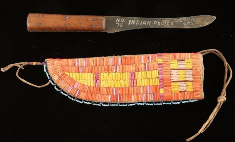 Trade knife has a wood handle and blade reads "#75 Indian Police Crow Reservation". Measures 11" overall with a 6" blade. Includes a very nice brain tanned leather scabbard with colorful quill work accented with sky blue and cobalt trade bead decoration. Good condition overall for its age.