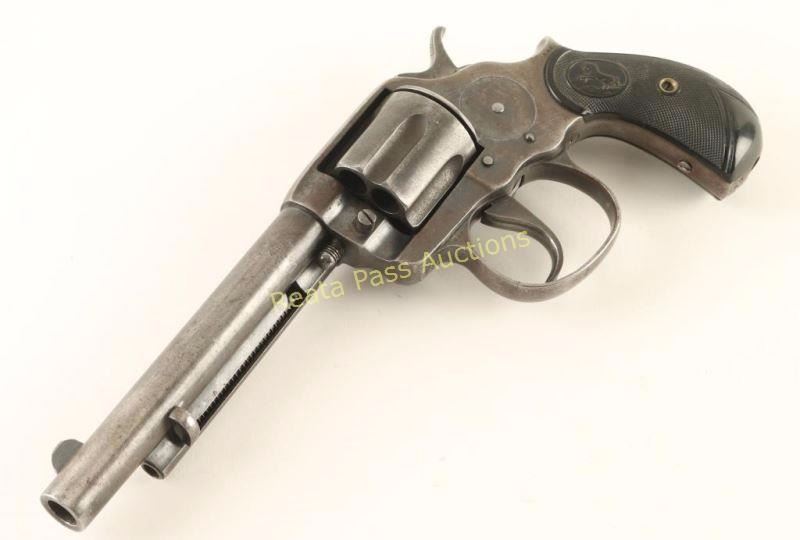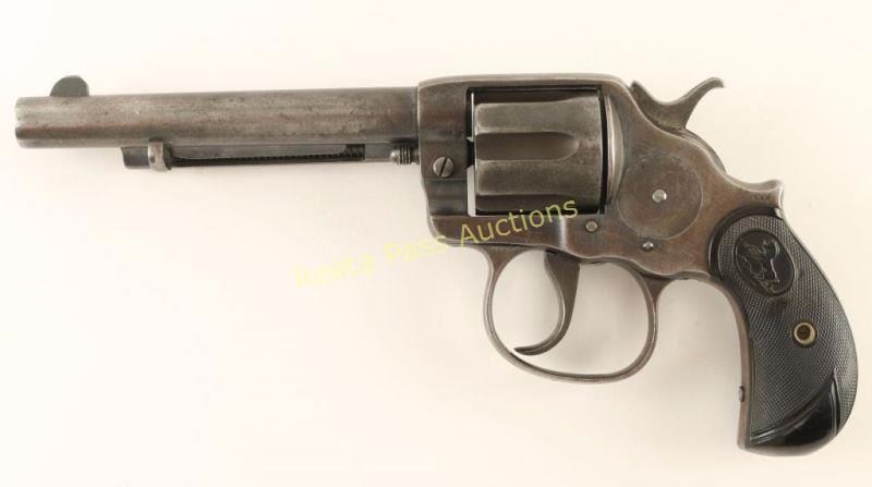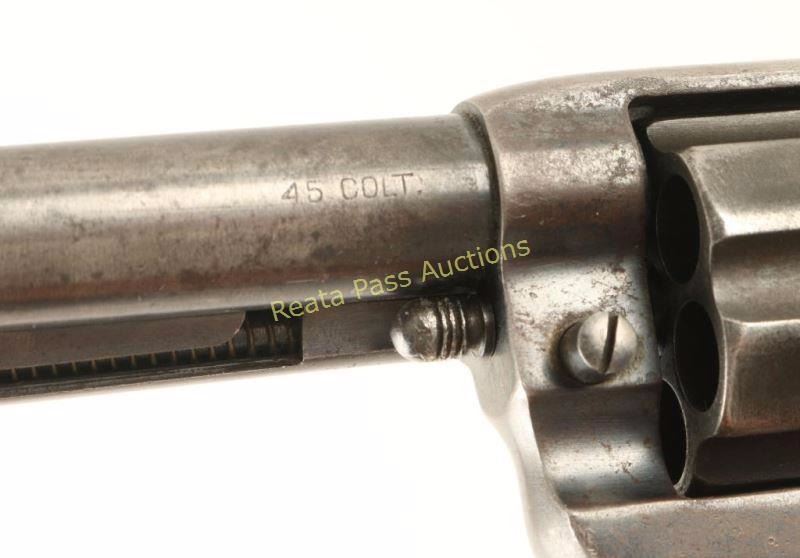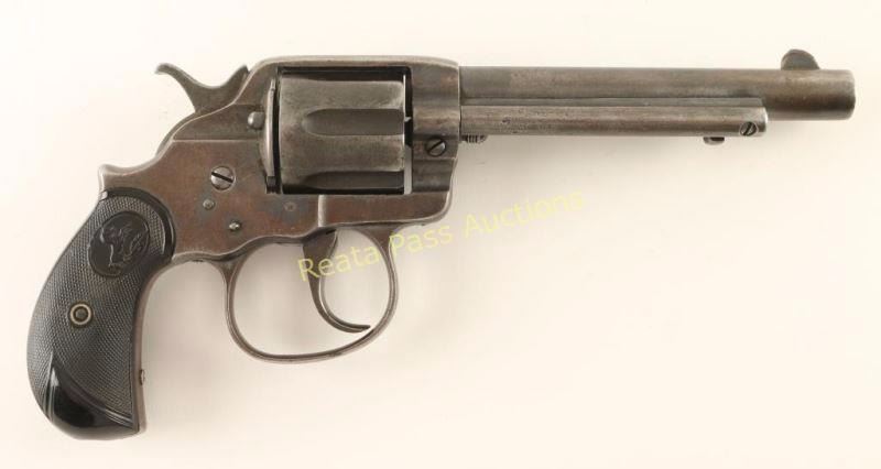 'Philippine' U.S. Ordnance contracted double action revolver chambered in .45 Colt, circa 1902. Features a blued finish, 6" barrel with single line address, ejector rod, blade front sight, 'v' notched rear sight, fluted six-shot cylinder, long smooth trigger, checkered hammer spur, large trigger guard, no lanyard ring and Colt checkered black hard rubber two-piece bird's head grips. Revolver retains approximately 15% of it's original blued finish with the balance turned to a grey patina. Marked "R.A.C." on the left side of the frame & triggerguard and "JTT", "1902", & "U.S." on th left side of the frame. Action performs well, bore is near excellent showing some light surface rust and grips are very good. Condition is good++. ***C&R Firearm*** ***Modern Firearm***
