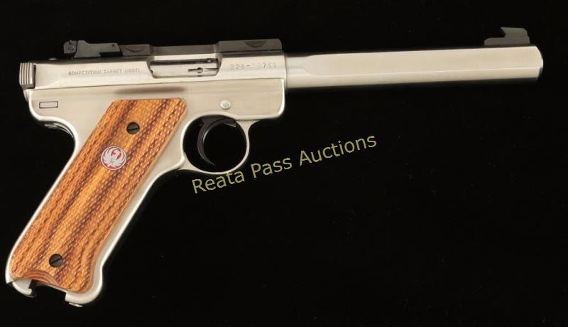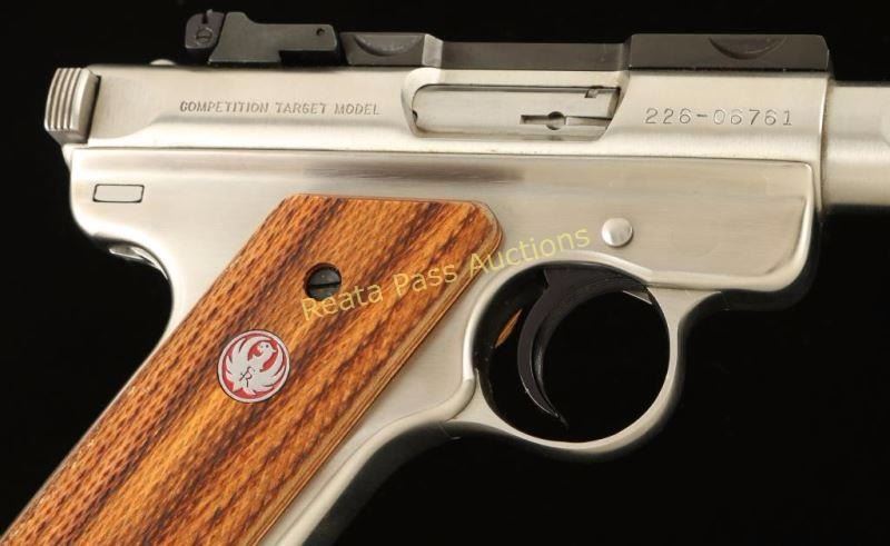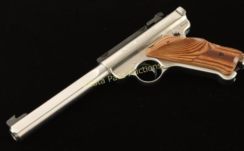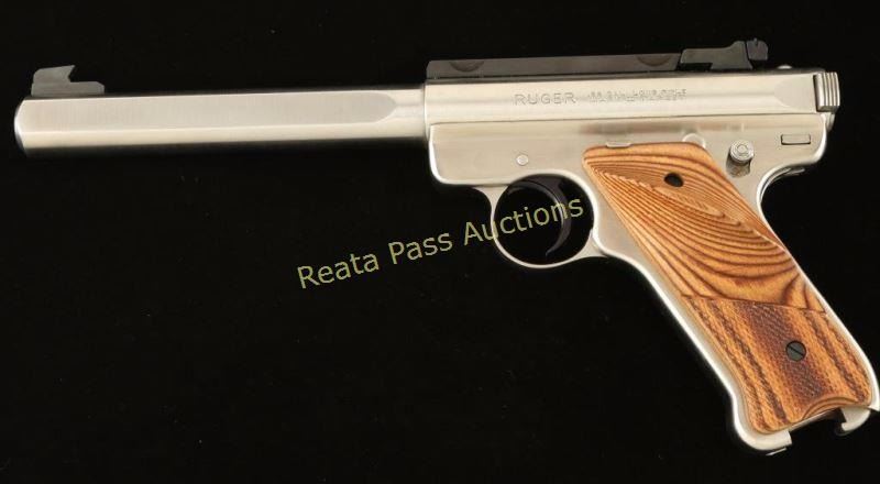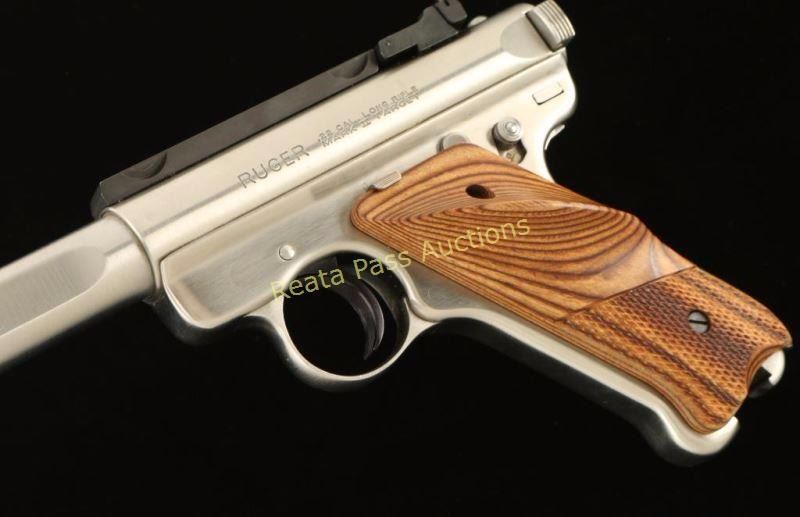 Stainless steel blowback-operated semi-automatic target pistol chambered in .22 Long Rifle. Features a brushed finish, 6.88" flat sided heavy barrel, patridge front sights, adjustable rear window sight, Ruger scope rail, serrated target trigger, hold open lever, thumb safety, no magazine and checkered two-piece laminated wood target grips with Ruger medallion on the right panel. Pistol exhibits very little wear with only slight slide marks on the bolt observed. Action is smooth, bore is pristine and wood grips are fine. Condition is excellent. ***Modern Firearm***