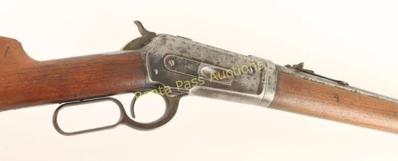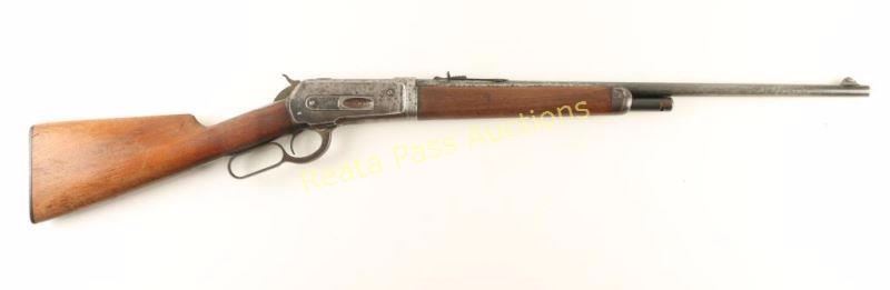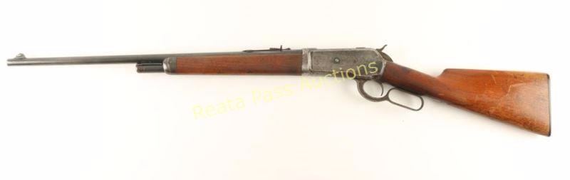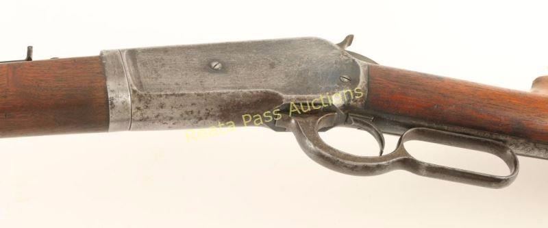 'Extra Lightweight Takedown Rifle' Lever action repeating rifle chambered in .33 Winchester Center Fire, circa 1902. Features a blued finish, 24" barrel, Lyman blade front sight, flat-top adjustable rear sight, 1/2 length tube magazine, smooth trigger, checkered hammer spur, metal forend cap, smooth walnut forend and straight grip shoulder stock with shotgun rubber buttplate. Rifle exhibits approximately 40% of it's original blued finish showing a heavy cleaning topped with scattered dark oxidation. Action is crisp, bore is very good and wood stocks are good with some blemishes & finish loss. Condition is good+. ***C&R Firearm*** ***Modern Firearm***