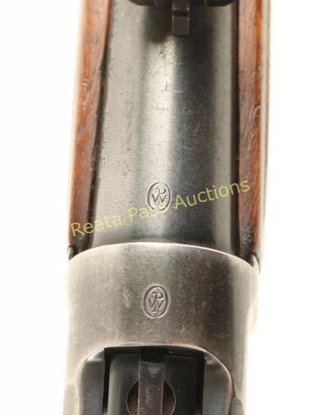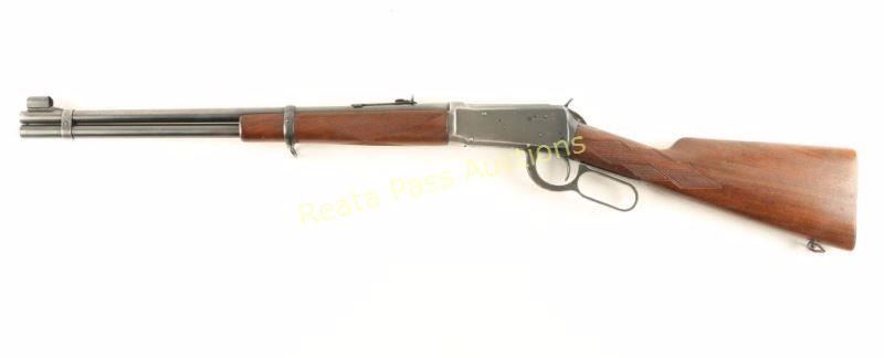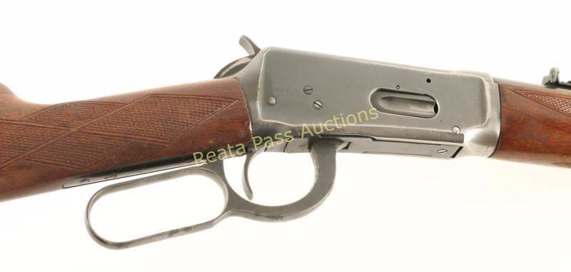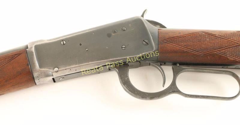 'Flat-band Eastern Carbine' Lever action repeating rifle chambered in .32 Winchester Special, circa 1945-1948. Features a blued finish, 20" barrel, ramped & hooded blade front sight, adjustable semi-buckhorn rear sight, full length tube magazine, smooth trigger, serrated hammer spur, sling swivels, drilled & tapped receiver for side mount sight, checkered walnut forend and straight grip shoulder stock with metal shotgun buttplate. Rifle retains approximately 60% of it's original finish showing carry wear, handling marks, and a small area of cleaned pitting on the magazine tube. The receiver also exhibits wear from a previously installed side mount sight and has a few areas of light rust, as does the lever. Action is smooth, bore is excellent, and wood stocks are very good+ with only minor blemishes. Condition is very good. ***C&R Firearm*** ***Modern Firearm***