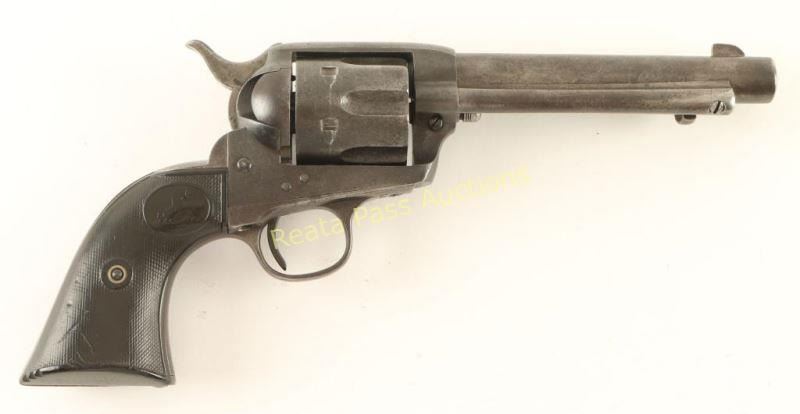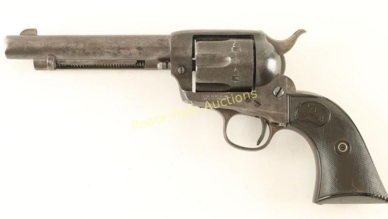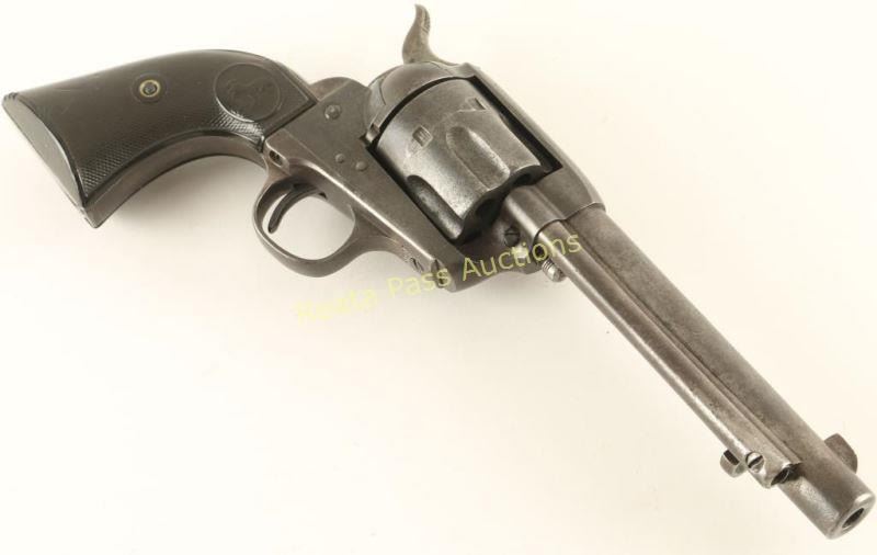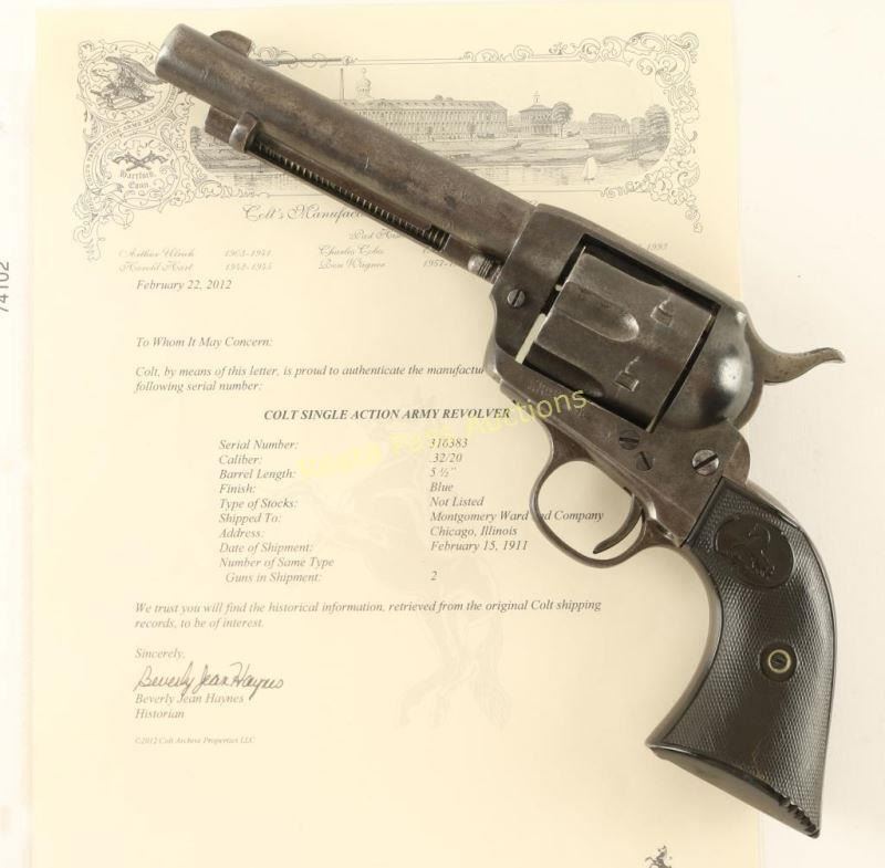 'First Generation' Single action six-shot revolver chambered in .32-20 Winchester, circa 1911. Features a blued & case hardened finish, 5 1/2" barrel with single line address, ejector rod, shortened blade front sight, 'v' notched rear sight, checkered hammer spur, fluted cylinder, and two-piece Colt checkered black hard rubber grips. Includes a Colt factory letter that confirms it's configuration and states it was shipped to Montgomery Ward & Company of Chicago, Illinois on February 15, 1911 in a two gun shipment. Revolver exhibits a dark grey patina with light scattered pin prick pitting on the frame & cylinder and some dark oxidation on the barrel. The hammer shows a considerable amount of case hardening in comparison to the rest of the gun and also has a few spots of dark rust. All markings are clear and all serial numbers match. Action is strong, bore is good and grips are worn semi-smooth with 9 notches, the initials 'LHB', 'TM' & dated 7-2-88. Condition is good. ***C&R Firearm*** ***Modern Firearm***