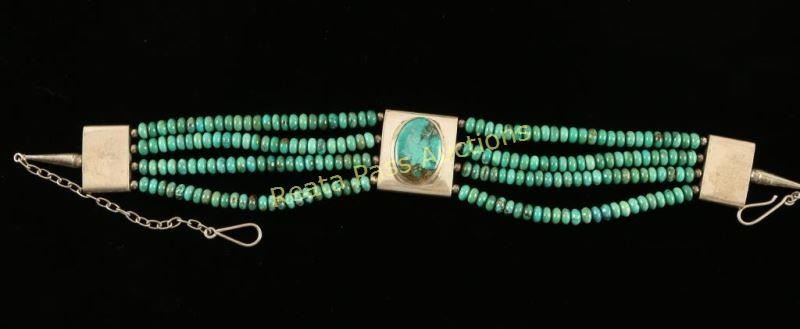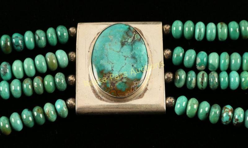Four strand turquoise choker accented with a center sterling silver pendant with a large oval turquoise cab. Retail $1200