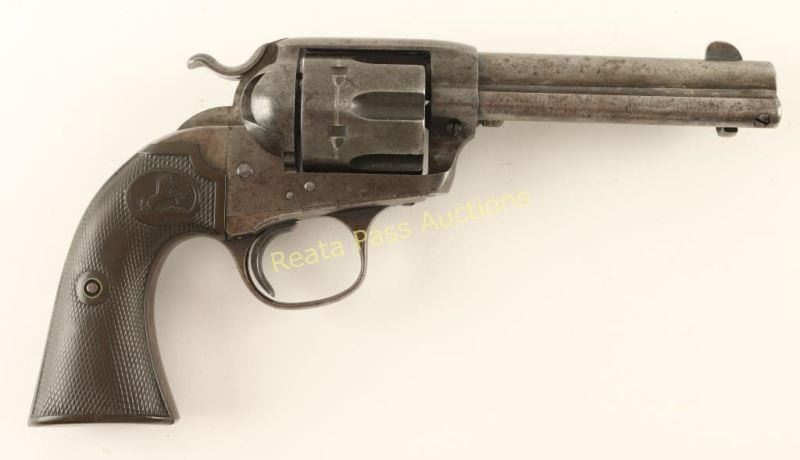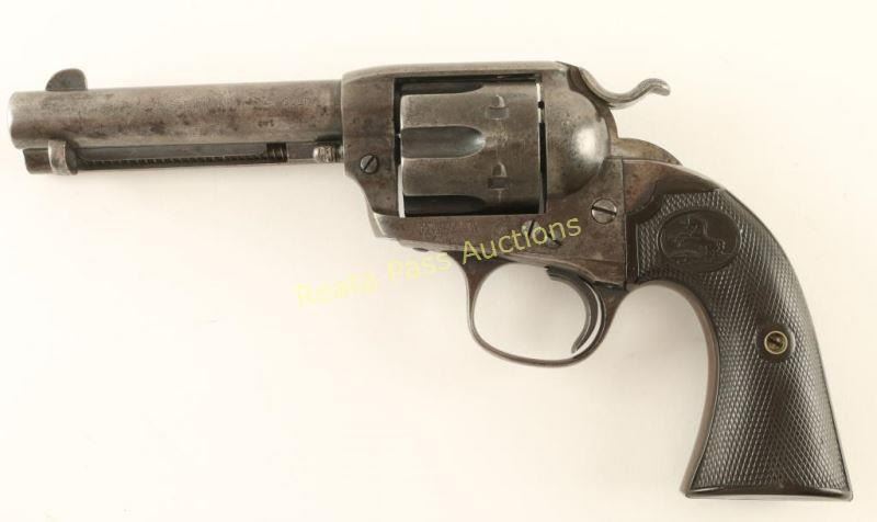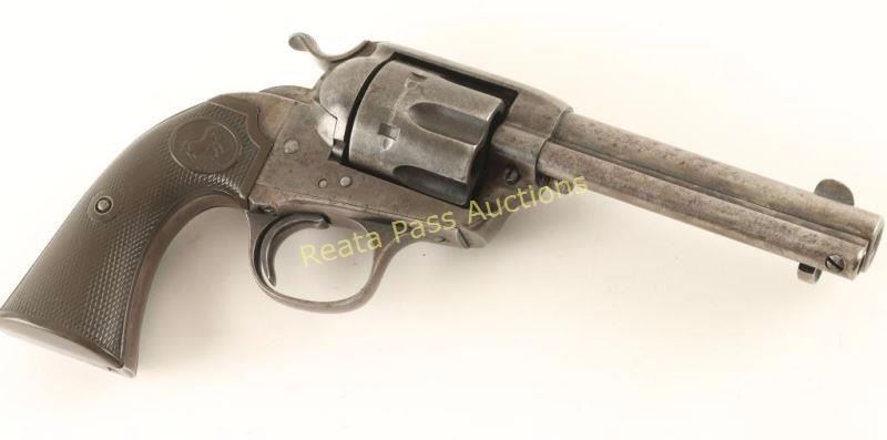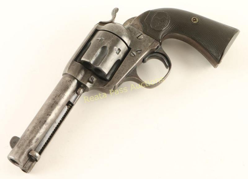 'First Generation' Single action six-shot revolver chambered in .41 Colt, circa 1909. Features a blued & case hardened finish, 4 3/4" barrel with two line address, ejector rod, blade front sight, 'v' notched rear sight, wide low-profile hammer spur, smooth trigger, fluted cylinder, and two-piece Colt checkered black hard rubber grips. Revolver exhibits small amounts of it's original finish in protected areas with a majority of it's metal surfaces turned to a grey/brown patina. All markings are clear and all serial numbers match. Triggerguard is stamped with 'VP' inside a triangle and 'W'. Action is strong, bore is good with some pitting near the muzzle and grips are very good. Condition is good+. ***C&R Firearm*** ***Modern Firearm***