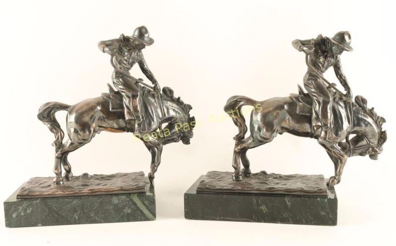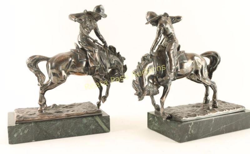 Cowboys on bucking broncs sitting on green marble bases. Measures 8"lx 8 1/2"h3 3/4"w. Nice addition to any library.