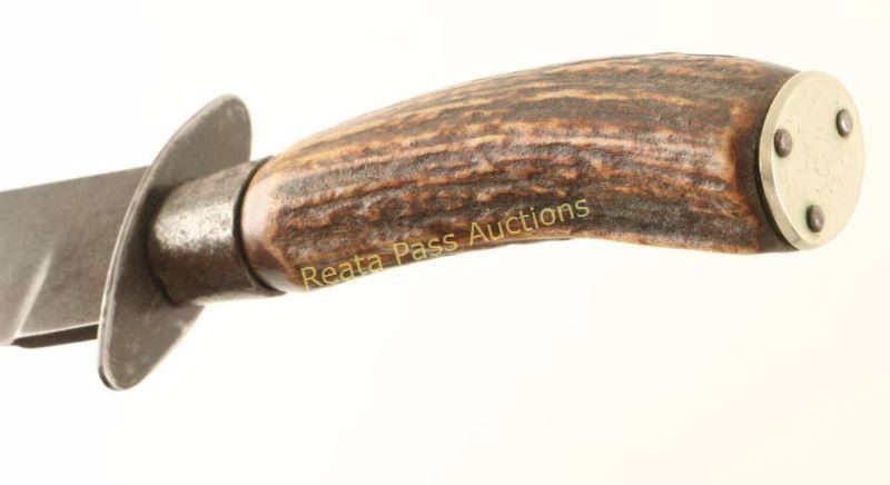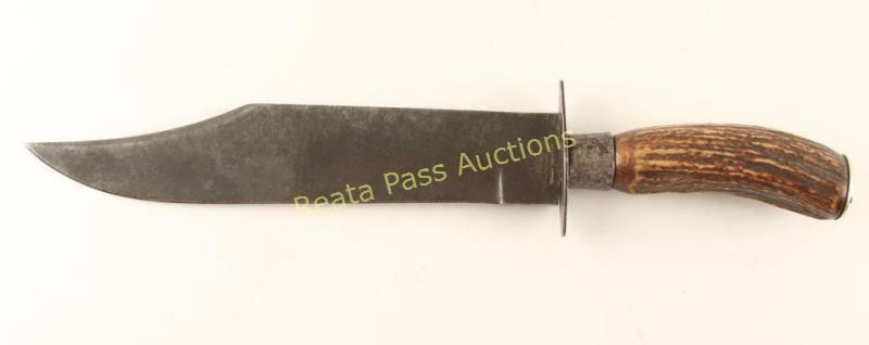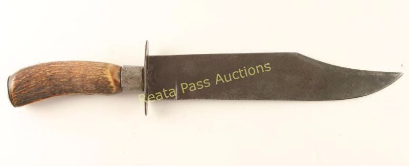 Largest of the American Bowie- style knives. Green River works J. Russell marked on ricasso. stag handle, measures 15 1/2" overall with a 10" blade.