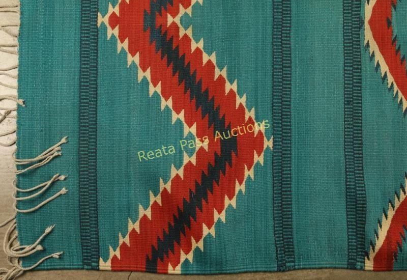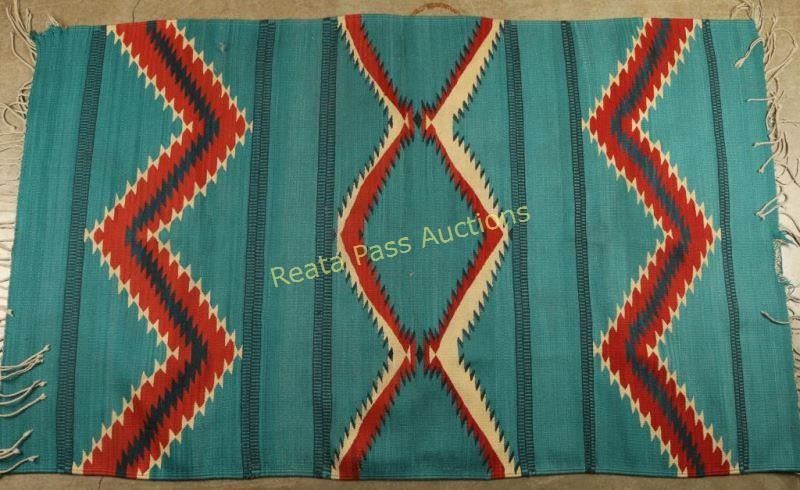 Turquoise, red and blue with a zig zag pattern and fringe. Condition is good, however it is missing fringe on one corner. Measures 68"l x42"w.