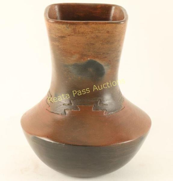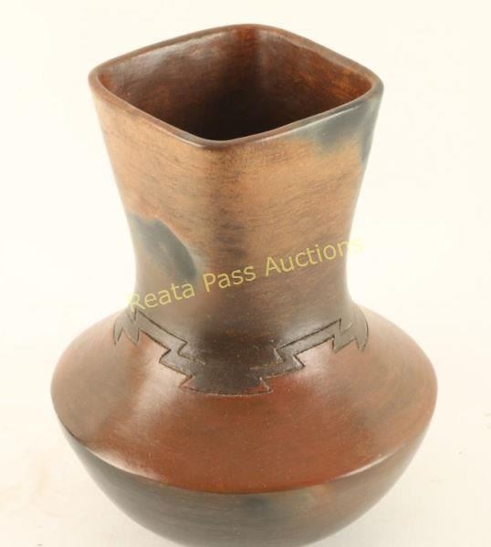 Navajo made by Susie Williams purchased from the Museum of Northern AZ. This jar was awarded the "Honoring of the Legacy" in 1994 from the museum. Measures 8"x7" approx. has brownish red finish with incised carved geometric pattern.