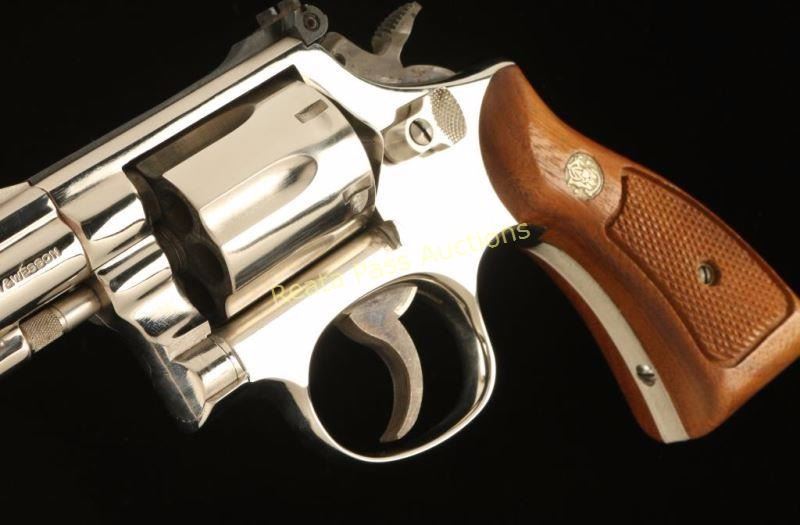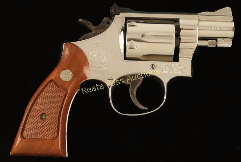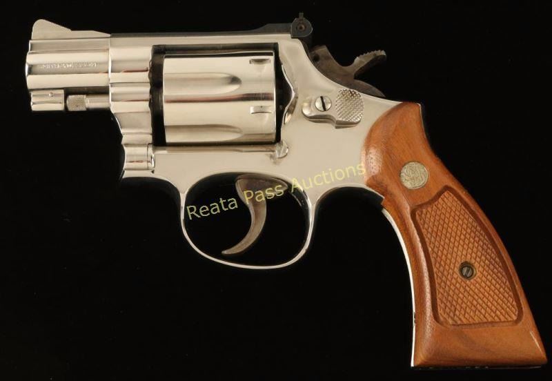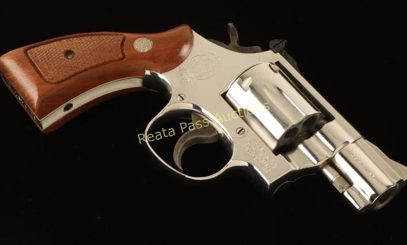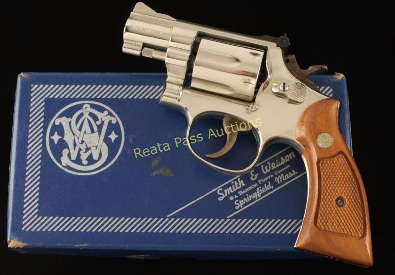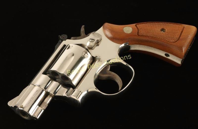 'K-38 Combat Masterpiece' Medium frame double action revolver chambered in .38 Special, circa 1977-1982. Features a nickel plated finish, 2" ribbed barrel, solid ramped front sight, micrometer click rear sight, fluted six-shot cylinder, serrated .265" service trigger, .375 semi-target hammer, and Smith & Wesson Magna grips. Includes the original factory blue box with documents. Revolver maintains a bright finish showing only superficial scratches and quite a bit of powder residue on the front cylinder face. Action is smooth, lock-up is very tight, bore is pristine, chambers are dirty and wood grips are fine. Condition is near excellent. ***Modern Firearm***