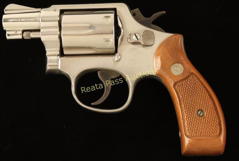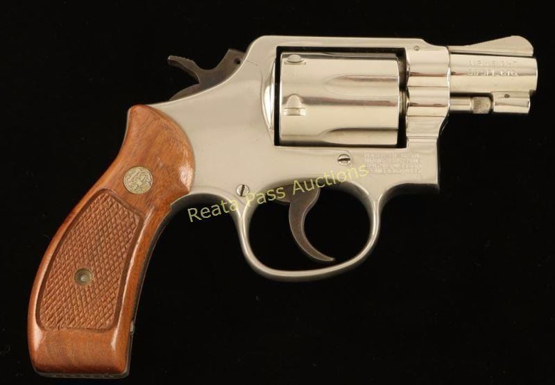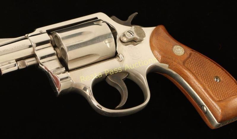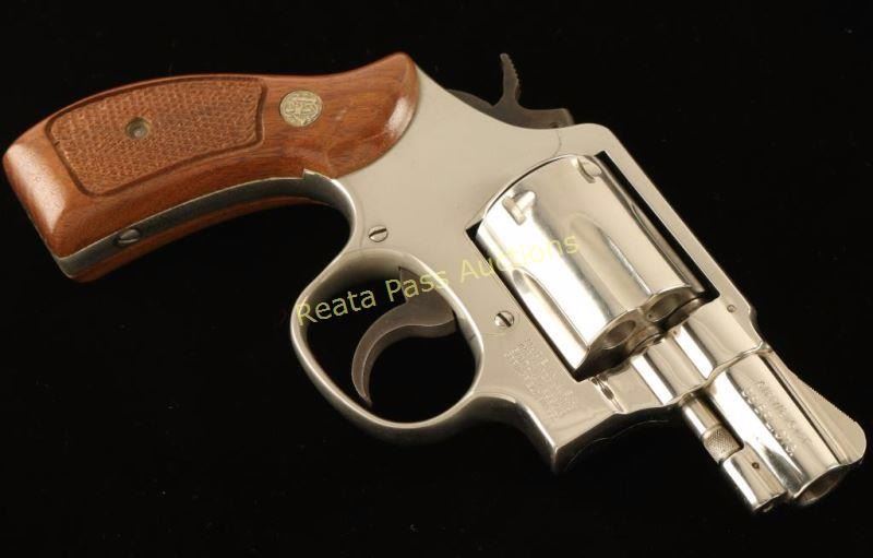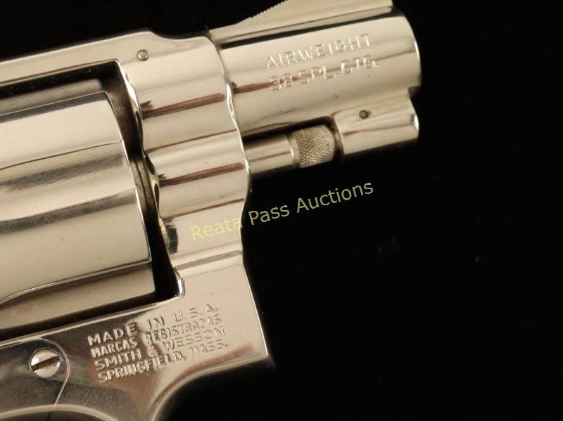 'Military & Police Airweight' Lightweight medium frame double action revolver chambered in .38 Special, circa 1977-1982. Features a nickel plated finish, pinned 2" barrel with solid rib, ramped front sight, notched rear sight, fluted six-shot cylinder, alloy round butt frame, serrated .258" service trigger, .258" service hammer and Smith & Wesson Magna grips. Finish remains bright on the barrel but has dulled on the cylinder and portions of the frame from oxidation. Action is crisp with tight lock-up, bore is very good and wood grips are near fine. Condition is very good. ***Modern Firearm***