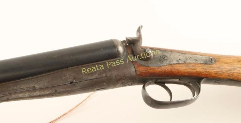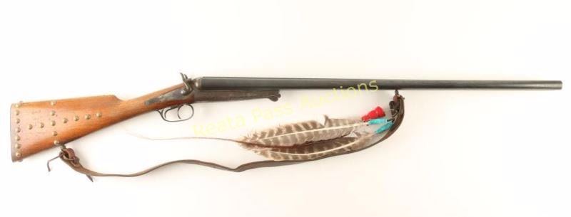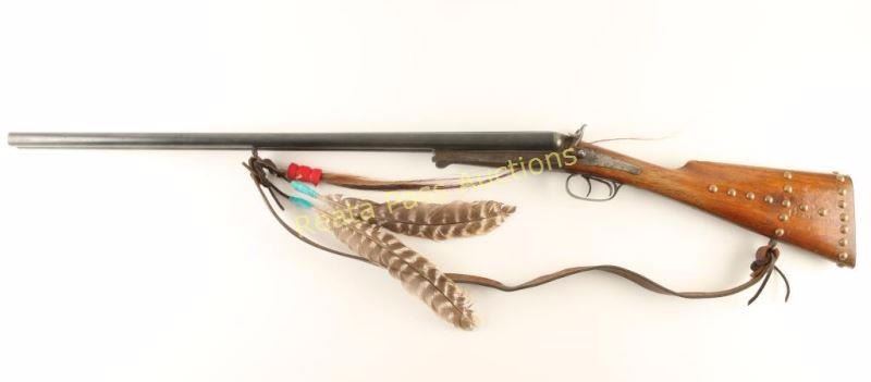 Swedish made double barrel side-by-side underlever shotgun chambered for 2 1/2" 12 gauge shells. Features blued 29.5" barrels with raised concave rib, case hardened receiver, sidelock action, extractor, exposed hammers, brown leather sling & decorative feathers, double triggers, and smooth wood pistol grip shoulder stock with metal buttplate & brass tack decoration. Barrels retain approximately 60% of their blued finish with light scattered rust throughout. Case hardened receiver also shows some rust and has mostly turned to brown patina with a trace of colors present in protected areas. Action functions well, bores are excellent and wood stock is good. Condition is good. ***Modern Firearm***