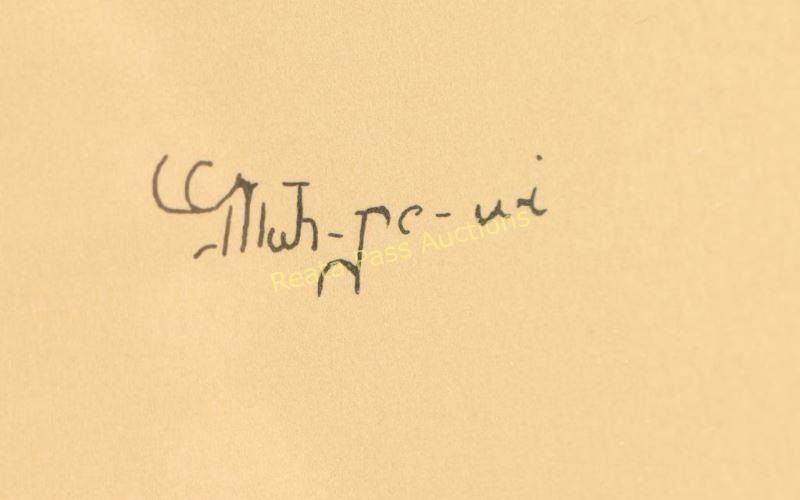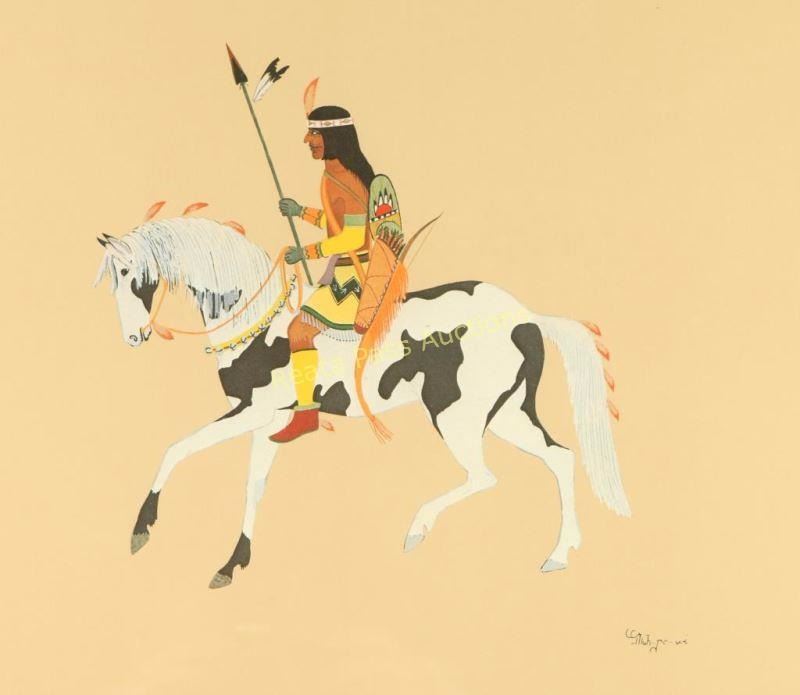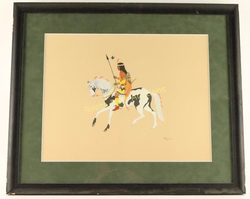 Depicting Indian warrior on horseback. Image measures 17 1/4"x13 1/2" with single mat and black wood frame.
