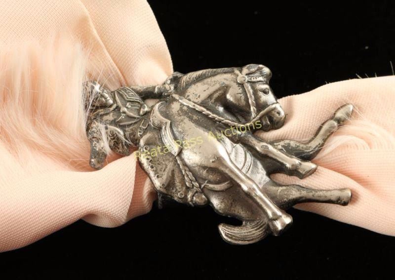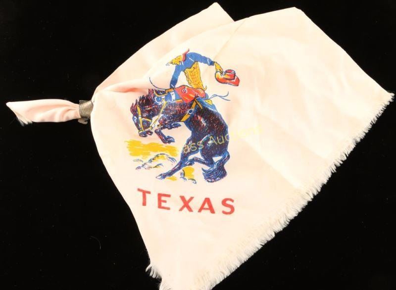 Neckerchief with cowboy on bucking bronco marked 'Texas' in a scarf keeper with bucking bronco.
