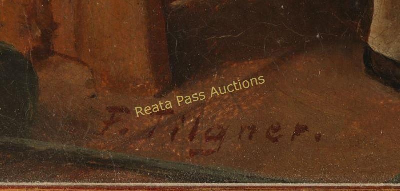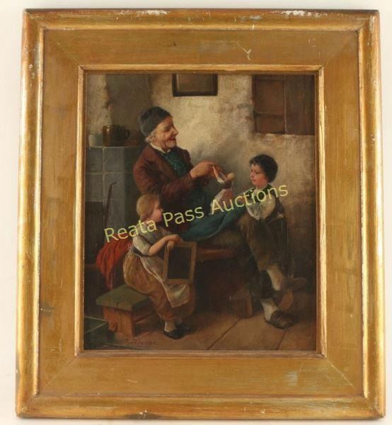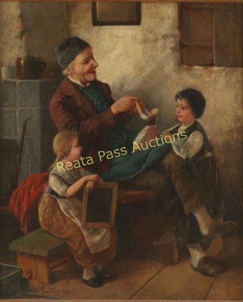 Excellent oil of man playing with doll by the hearth as his children look on. Signed F.T. Agner lower left. Image measures 10"'x12 1/4" in gold painted wood frame.