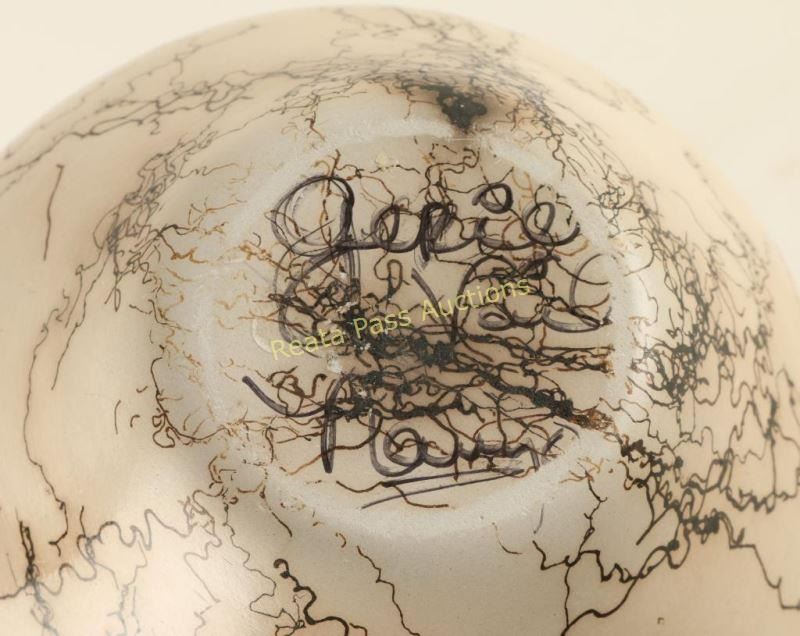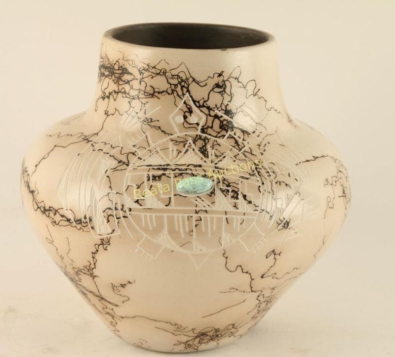 White finish with a turtle effigy incised carved accented with turquoise. Measures 6"x6".