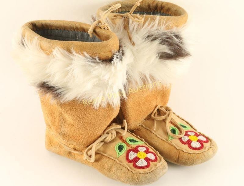 High top ladies moccasins, Bead work and rabbit fur accents. They measure 9 1/2" long by 9 3/4" tall. Brown suede leather construction.