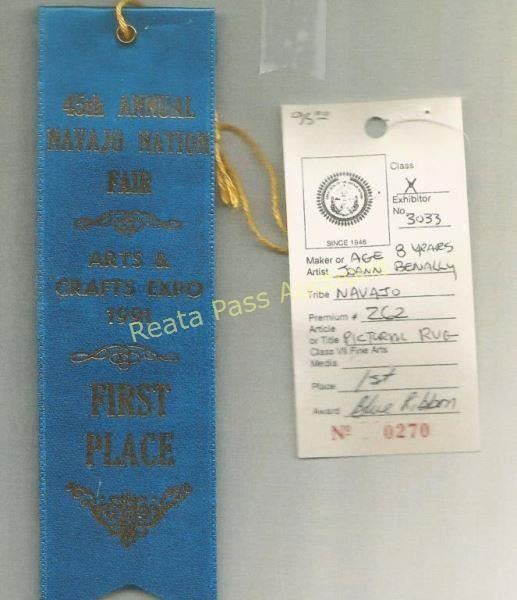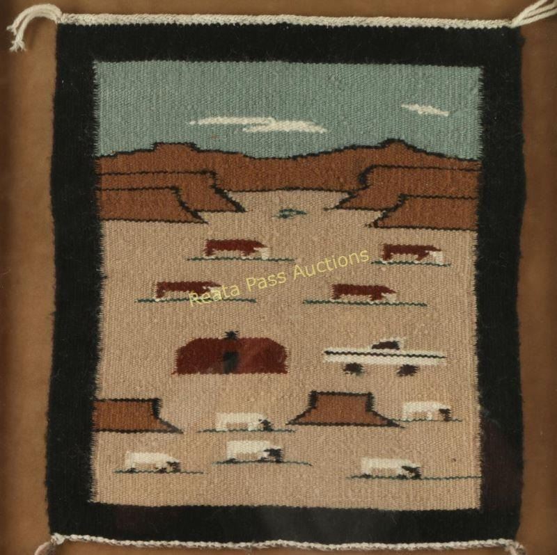Framed, by Joanne Benally depicting cows at pasture. Measures 15 1/2"x16 1/2", won first place at the 44th Annual Navajo Fair in 1991.