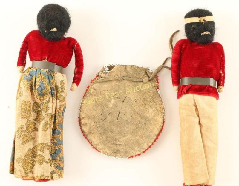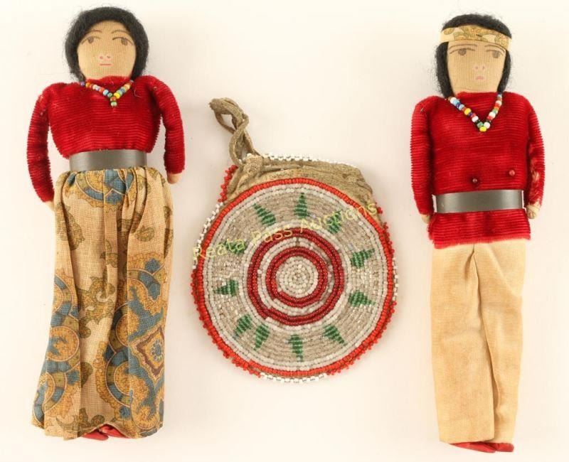 Small buckskin coin purse fully beaded on one side with a sunburst design. Two small fabric antique Indian dolls, one male, one female.