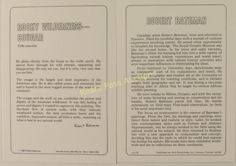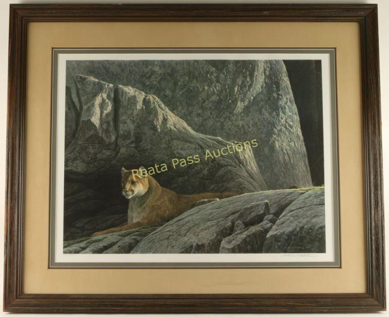 377/950 depicting mountain lion resting on a rocky ledge, signed lower right. Image measures 28"x21" in triple mat and wood frame. From the Bill A. Gary estate Prescott, AZ.