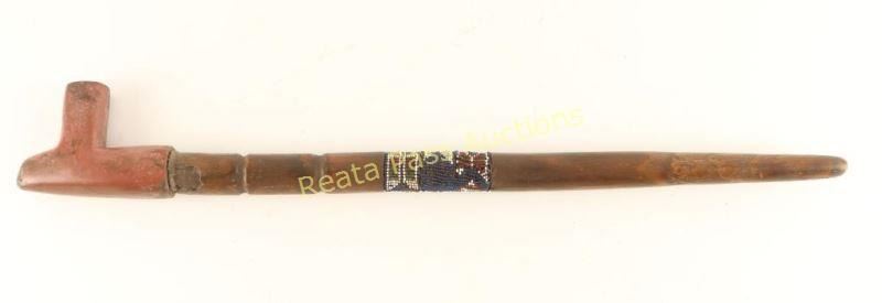 Handmade catlanite pipe bowl with a wood carved stem accented with colorful trade beads. Measures 22 1/2" overall, shows age and has some losses to stem.