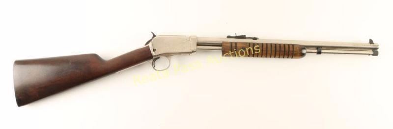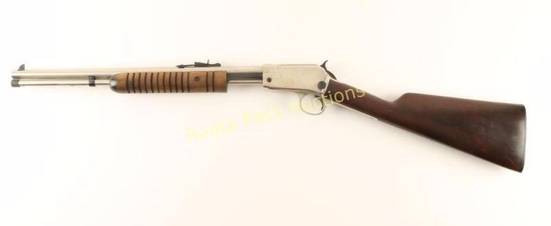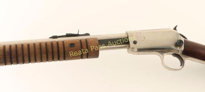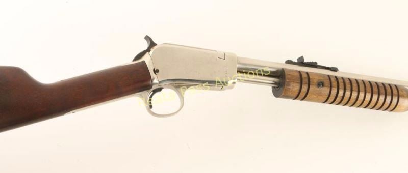 Brazilian made stainless steel slide-action sporting rifle chambered in .22 Long Rifle, modeled after the Winchester Model 62. Features a brushed finish, 16.5" barrel, large blade front sight, adjustable rear sporting sight, full length tube magazine, take-down receiver, serrated hammer spur, smooth trigger, grooved hardwood slide handle and straight grip shoulder stock with black plastic buttplate. Rifle exhibits moderate handling wear with a some scratches and scattered surface rust on the front sight, magazine tube head, barrel & bolt. Action is smooth, bore is excellent and wood stocks are near fine. Condition is very good. ***Modern Firearm***