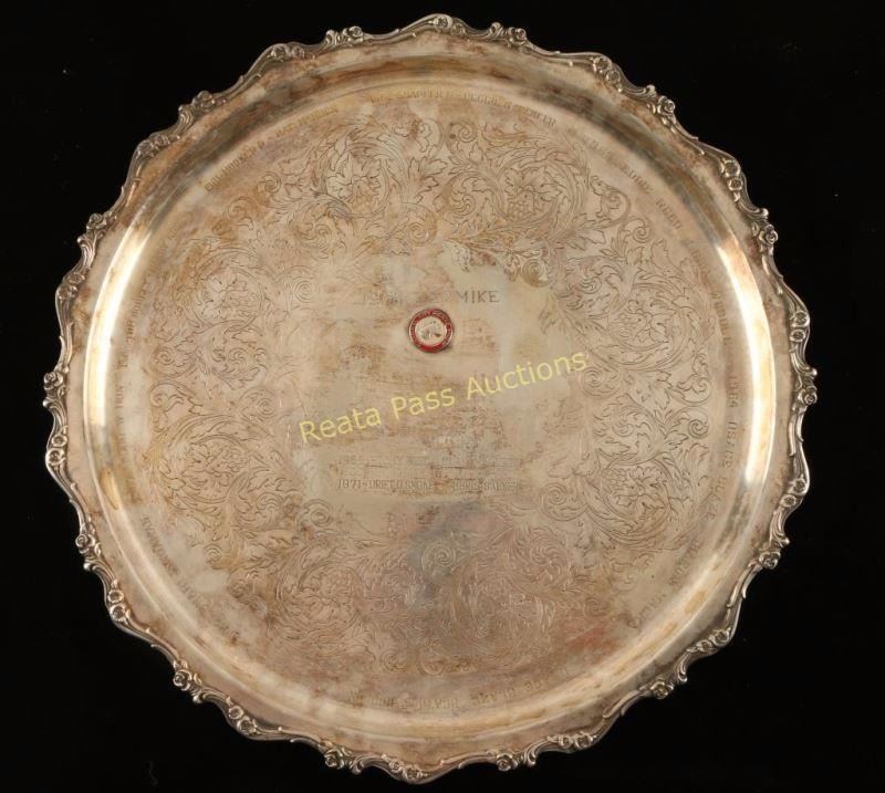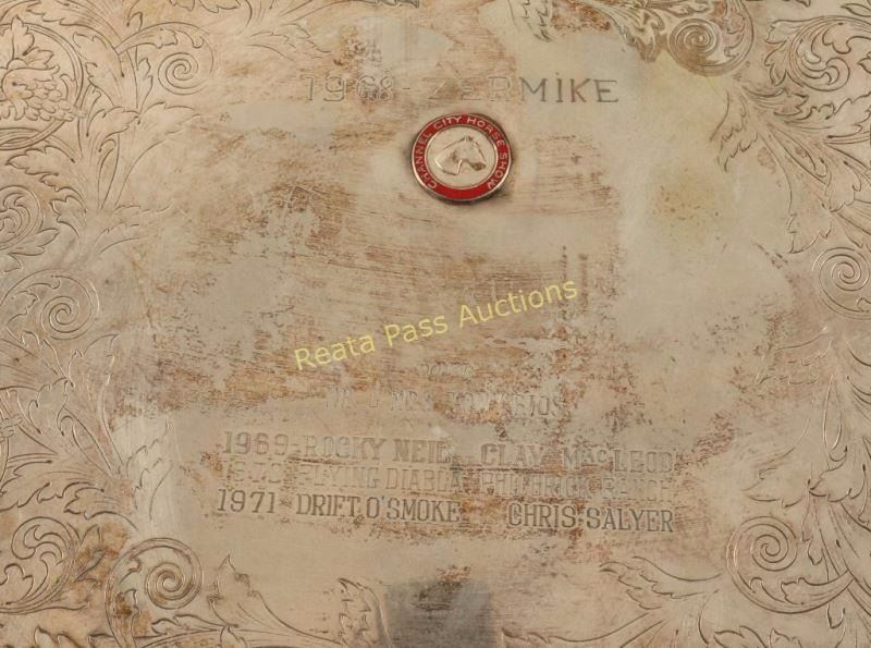 Reads "1968 Zermike for the Channel City Horse Show, Stock Horse Stake Perpetual Donor Mr. & Mrs. Tony Rios". Round presentation platter which is silver plated with a floral motif. Measures 18" dia. We previously sold Tony Rios collection of Santa Barbara, CA-well known rancher several years ago.