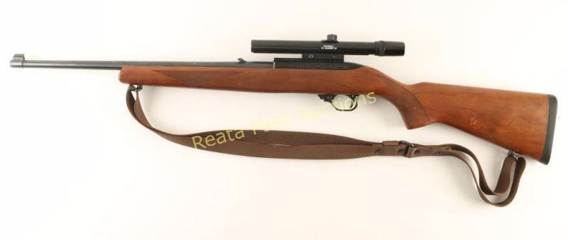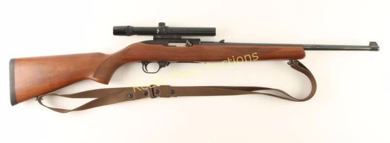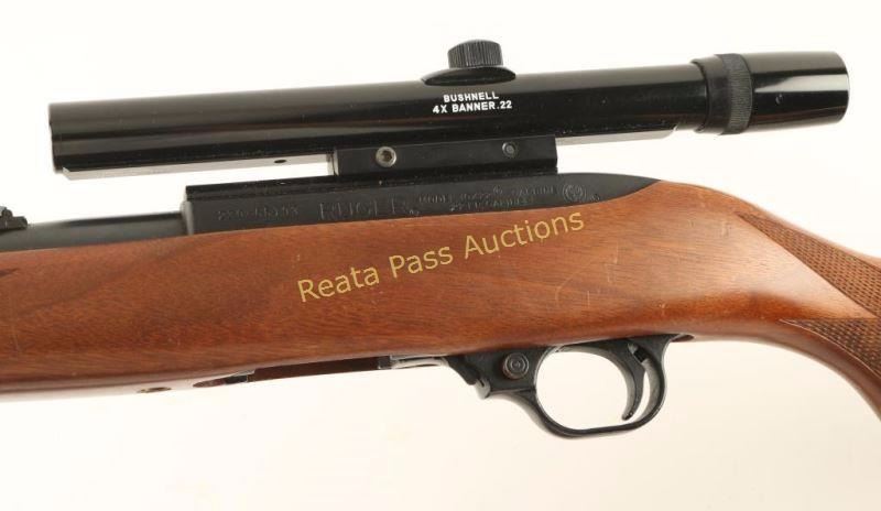 'Deluxe Sporter' Magazine fed semi-automatic sporting rifle chambered in .22 Long Rifle, circa 1989. Features a blued finish, 18.5" barrel, blade front sight with brass bead, flip-up adjustable rear sight, Bushnell Banner 4x scope, no magazine, push button safety, bolt hold open lever, smooth trigger, brown nylon sling and one piece checkered walnut pistol grip shoulder stock with rubber recoil pad. Rifle exhibits approximately 97% of it's original blued finish showing very little wear. Action is smooth, bore is excellent and wood stock is very good+ with some small blemishes. Condition is near excellent. ***Modern Firearm***