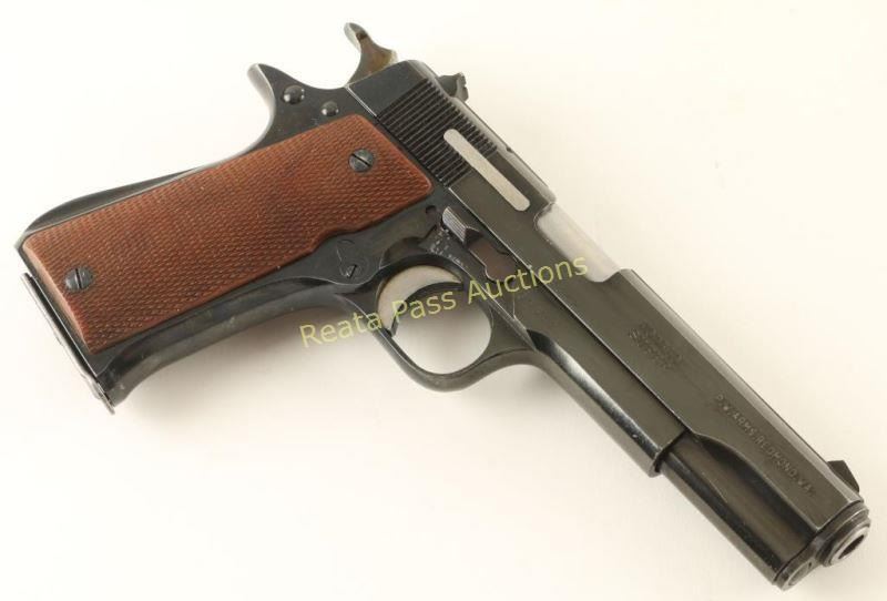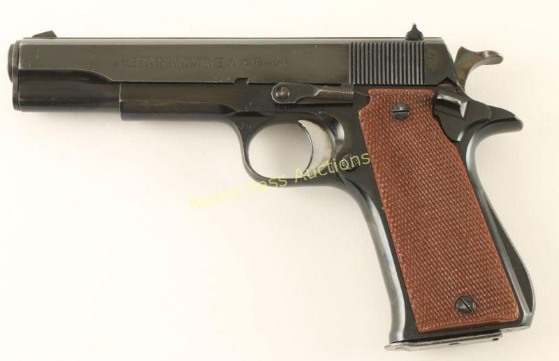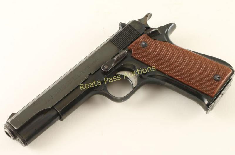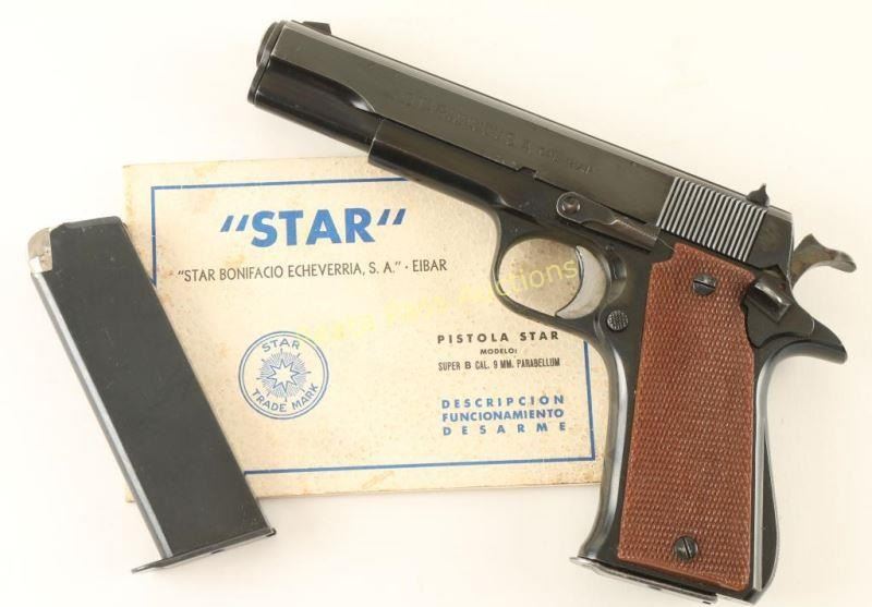 Spanish made semi-automatic pistol chambered in 9x19mm and designed along the lines of the 1911. Imported by P.W. Arms of Redmond, W.A. with import marks on the slide. Features a blued finish, 5" barrel, patridge front sight, dovetailed rear window sight, case hardened hammer with checkered wide spur, serrated trigger, thumb safety, push button magazine release, 8 round magazine, checkered backstrap and two-piece checkered brown plastic grips. Includes manual, cleaning rod and extra magazine. Pistol exhibits approximately 97% of it's original blued finish showing only edge wear and scattered scratches. Action is smooth, bore is pristine and plastic grips are fine. Condition is near excellent. ***Modern Firearm***