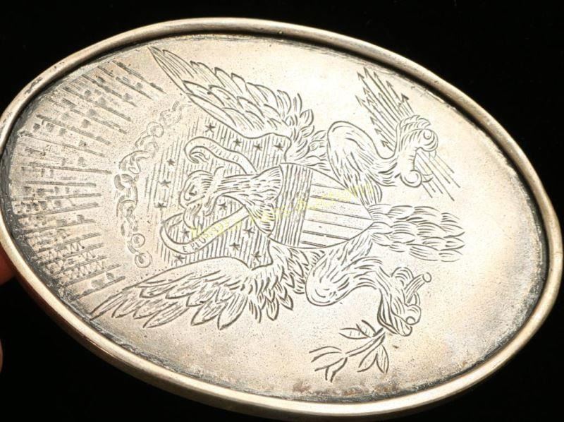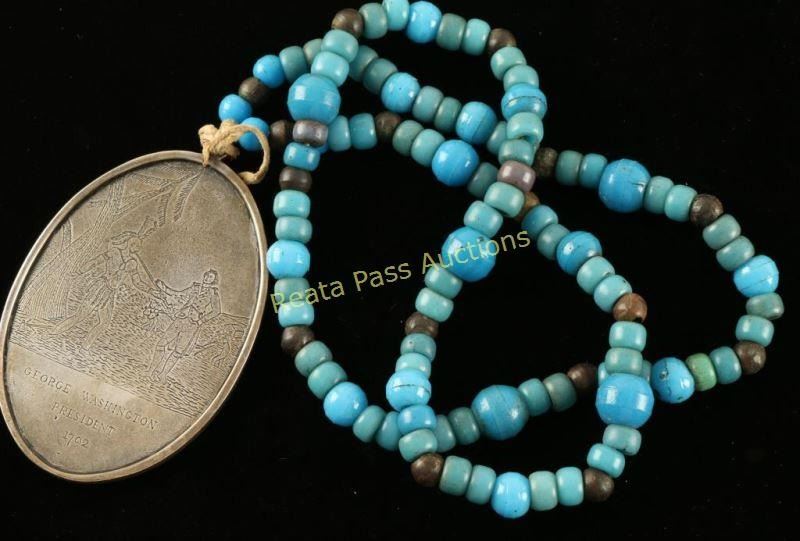 Beaded necklace with eagle on other side. Blued glass beads in Riker mount.