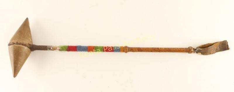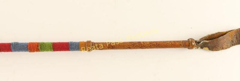 Stone carved double pointed edge with beaded leather wrapped handle. Measures 20" overall shows some loss to beadwork at one end.
