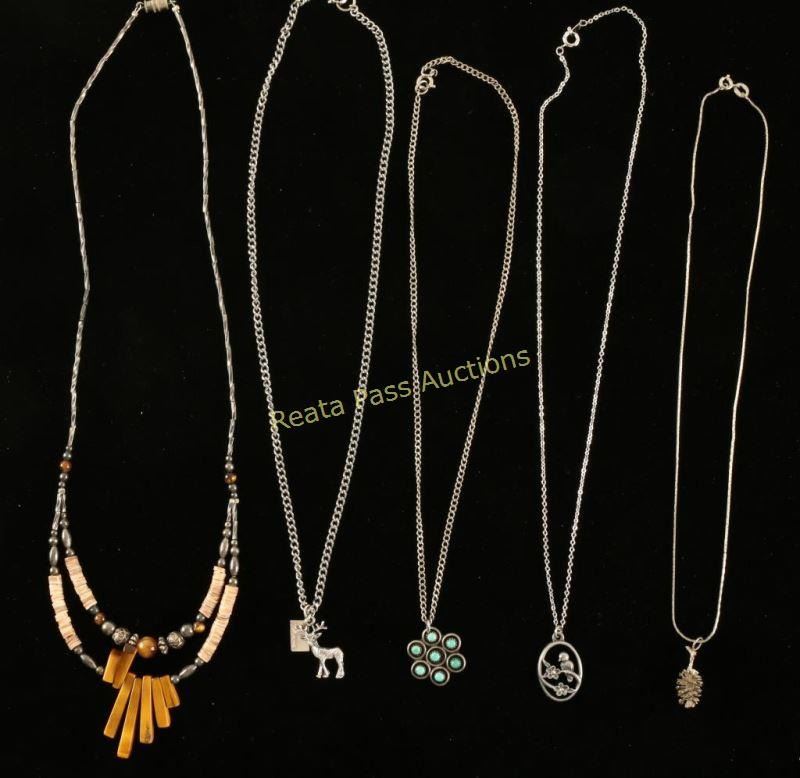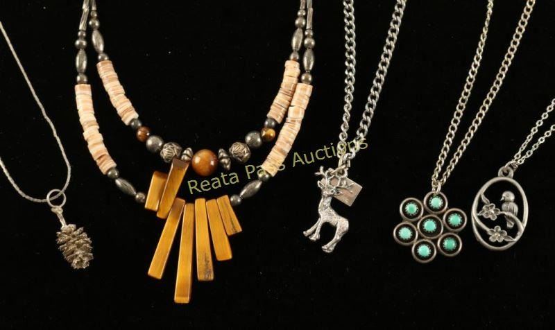 1 Beaded Tiger's Eye, 1 Turquoise, 1 Buck Pendant, 1 Pine Cone Pendant, and 1 Bird Pendant. All appear to be nickel not sterling.