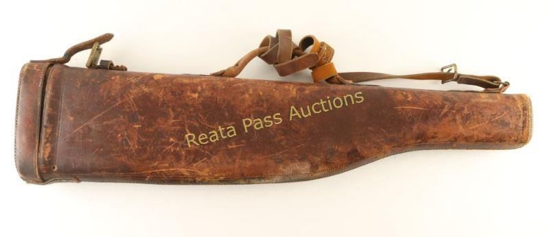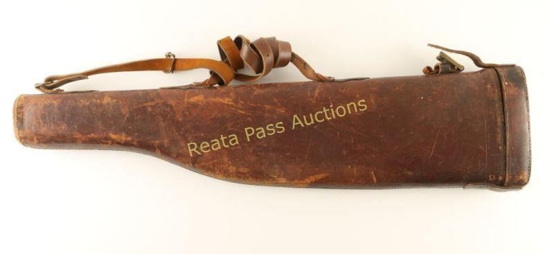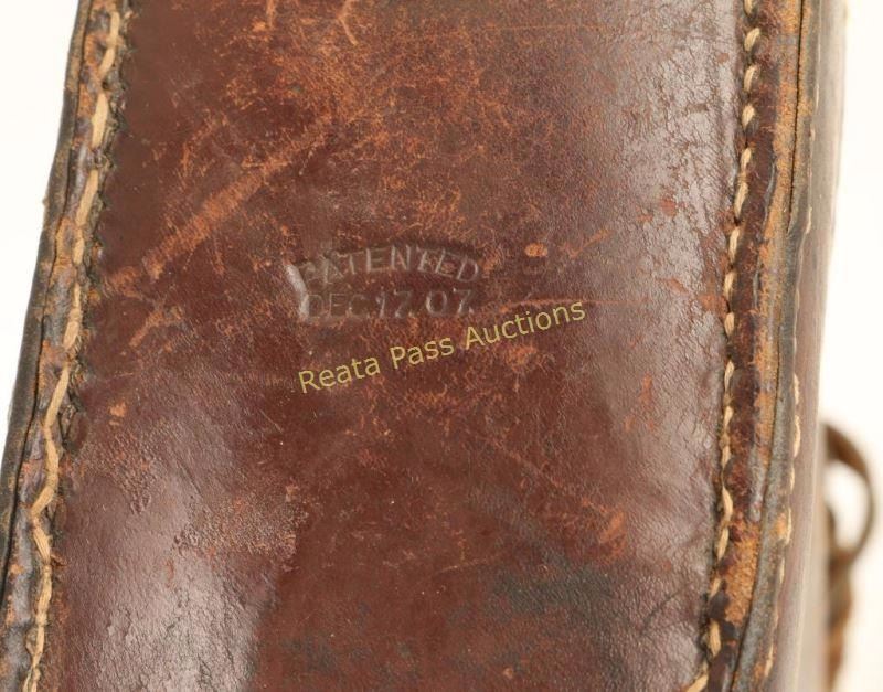 Smooth brown leather construction with replaces leather hinge and latch strap. Marked "PANTENTED/DEC.17.07" with no observed makers mark. Shows age and use, Condition is good.