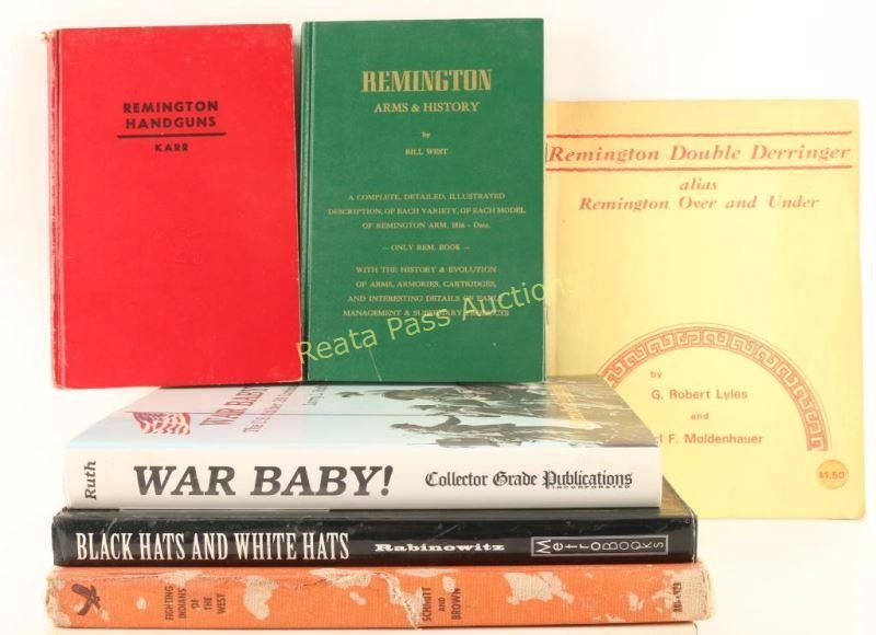 Including; "Remington Handguns" by Charles Lee Karr, Jr. and Caroll Robbins Karr, "Remington Arms and History" first edition by Bill West, and a softcover "Remington Double Derringer alias Remington Over and Under" by G. Robert Lyles and Karl F. Moldenhauer. "Custer in Photographs" by D. Mark Katz, "Fighting Indians of the West" by Martin F. Schmitt and Dee Brown, "Black Hats and White Hats" by Harold Rabinowitz, and "War Baby!" by Larry L. Ruth.