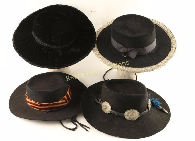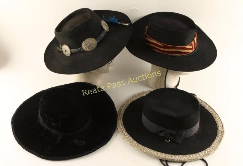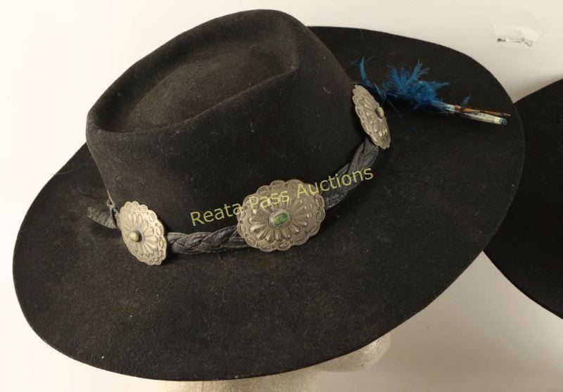 1 Stetson XXX Beaver quality John Stetson & Co. New York Hat Stores, has grosgrain band with silver braid trim. 1 Black Felt Eddy Bros. Bar Ranch size 7 1/8 with a faux fur band. 1 Black 100% wool with 5 concho braided band with feathers. 1 Black Velveteen with large brim.