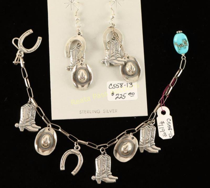 All sterling silver charm bracelet with cowboy boot, horseshoe, cowboy hat , and single turquoise cab. Includes sterling dangle earrings with charms that match. Retail Tag bracelet 119.00 and earrings 225.00. From the Charles Meyers Collection, indian trader Sun City Arizona.