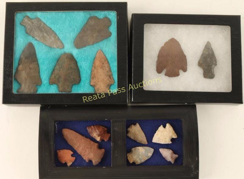 1 Black frame with two separate areas for arrowheads. 2 small Riker cases, one with two arrowheads, the other with five arrowheads. Offered "as is", we don't guarantee the authenticity of this item, please do your research. All sales are final.