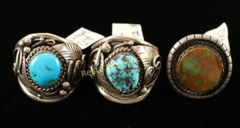 1 Vintage with large round green and gold turquoise stone, 2 with center light and sky blue stones with silver leaf and rope design band sizes 12 and 12.5.