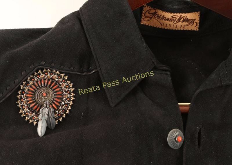 made by Glossmer Wings Santa Fe. Black Suede shirt with sterling silver concho buttons with an engraved sunburst design with coral cabs, 2 round beaded decorations accented with petitte point coral and sterling setting with feathers, the back also has a decoration and bead work. Beautiful shirt not marked but appears to be a Large or XL.