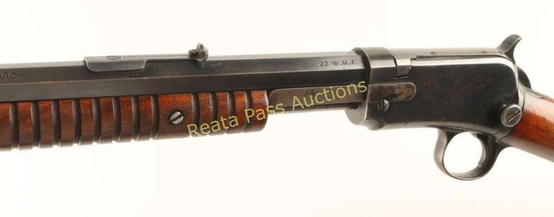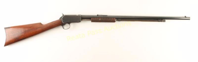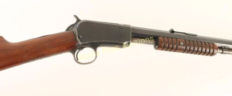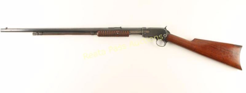 'Third Model' High condition slide action take-down repeating rifle chambered in .22 Winchester Rimfire, circa 1915. Features a blued finish, 24" octagonal barrel, 3/4 length tube magazine, blade front sight, adjustable rear sporting sight, smooth trigger, checkered hammer spur, take-down receiver, grooved walnut slide handle and straight grip shoulder stock with crescent metal buttplate. Rifle retains approximately 80% of it's original blued finish with the majority of the wear on the top of the bolt and on the bottom of the magazine tube, trigger guard & lower tang. The receiver also has some light scattered oxidation and a single spot of dark rust. Action is smooth, bore is excellent, buttplate shows rust and wood stocks are fine. Condition is near excellent. ***C&R Firearm*** ***Modern Firearm***
