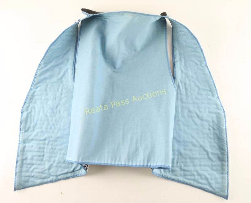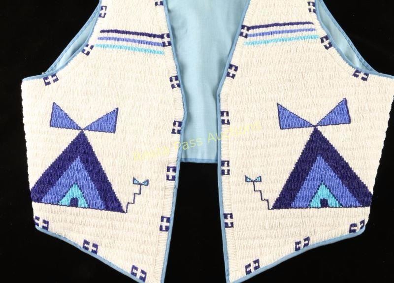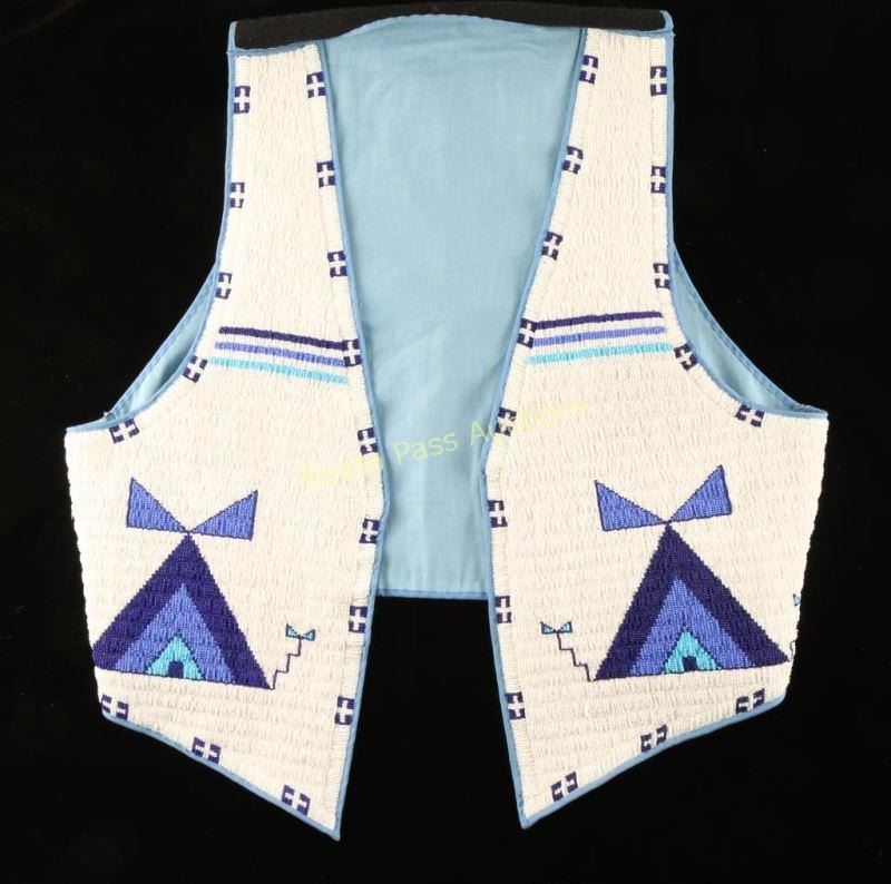 White beaded vest accented with two tone blue teepees, stripes and crosses all on a blue cotton material and with a black felt back. Very good condition.