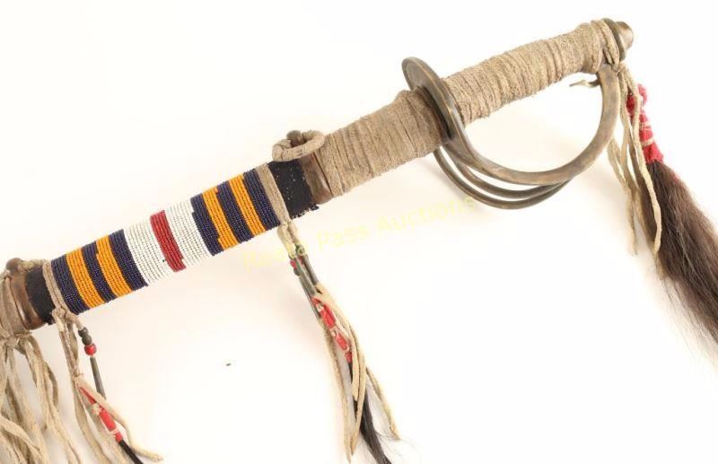 Measures 40" overall with a 34" blade. Intricate bead work, horsehair tassles, and leather fringe sheath from a noted Texas collection.