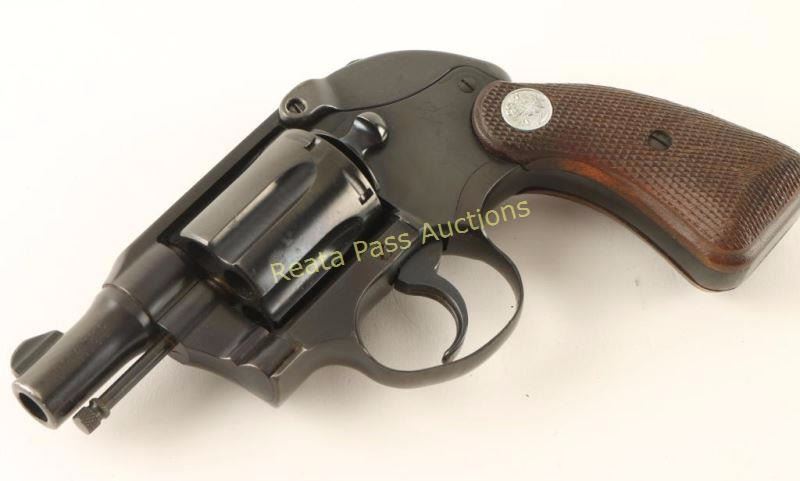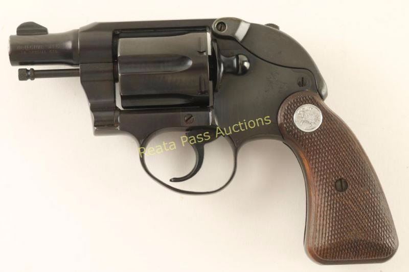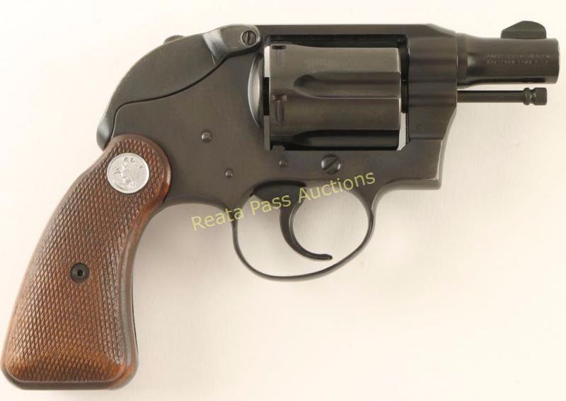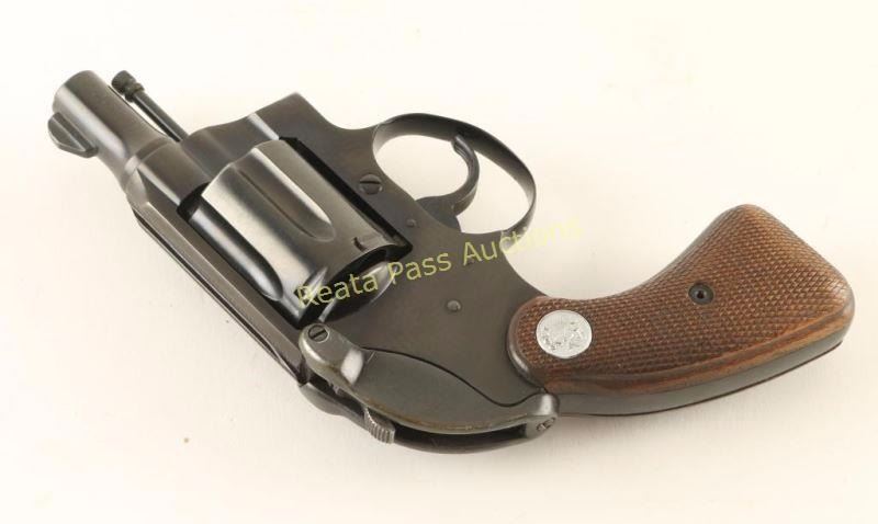 '2nd Issue' Snub nosed double action revolver chambered in .38 Special, circa 1958. Features a blued finish, 2" barrel, fixed sights, long fluted six-shot cylinder, serrated trigger & hammer spur, Colt marked hammer shroud, smooth grip frame, and Colt medallion checkered wood grips. Revolver retains approximately 90% of it's original blued finish showing very little wear, light handling marks and some scattered oxidation & surface rust forming. The hammer shroud shows heavy wear with a faint Rampant Colt marking and only a small amount on finish retained in the protected areas. Action is crisp with solid lock-up, bore is excellent, and wood grips are very good. Condition is good to very good. ***C&R Firearm*** ***Modern Firearm***