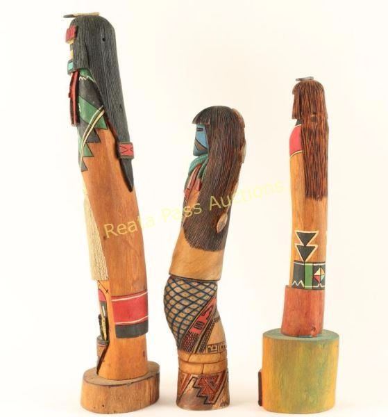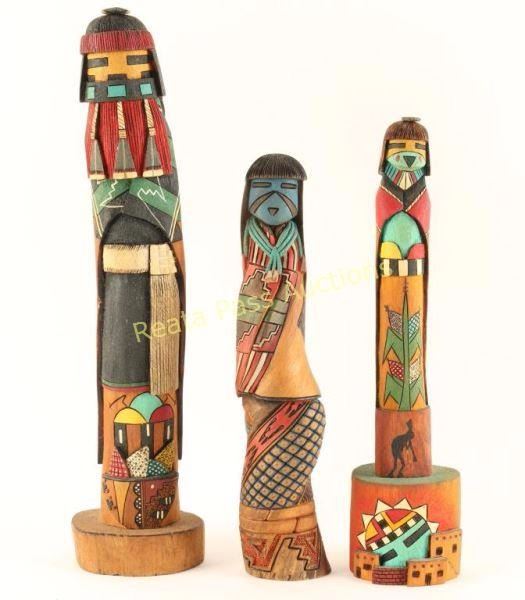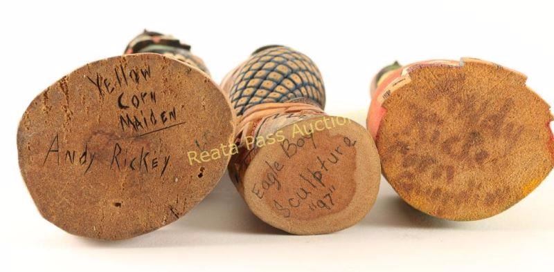 All three carved of a single piece of wood and hand painted by noted sculptor Andy Rickey. Including Corn Guardian, Yellow Corn Maiden , and Eagle Boy-all signed. Some of the signatures are faint. Condition overall excellent.