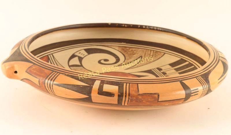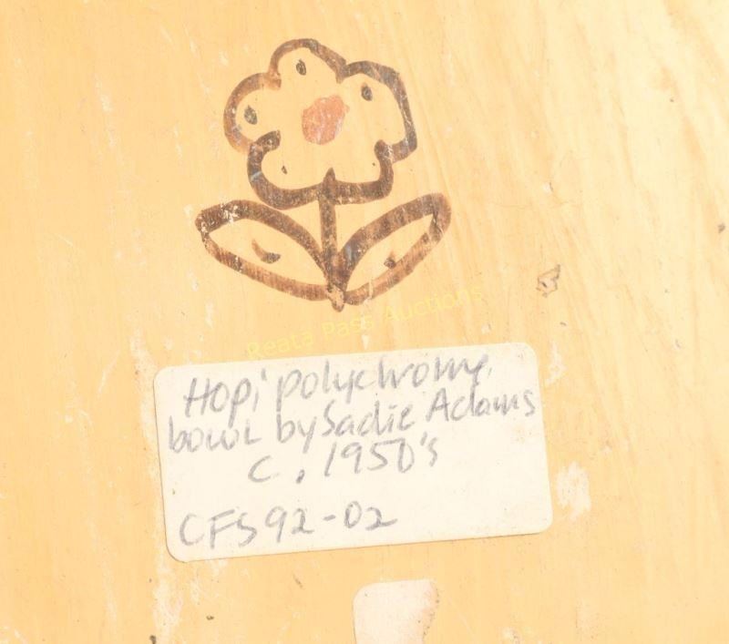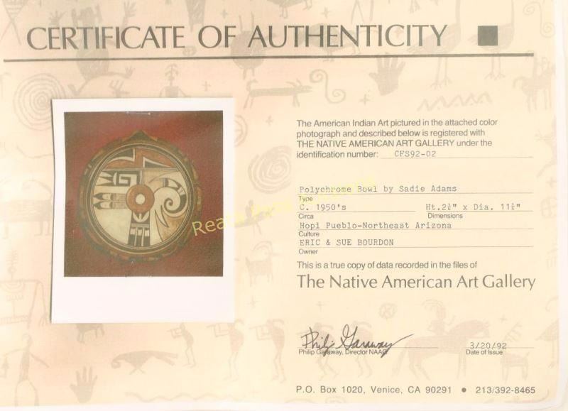 Made by Sadie Adams circa 1950s. 11" dia. includes Certificate of Authenticity from the Native American Museum signed by director Gallaway. Good condition.