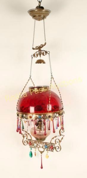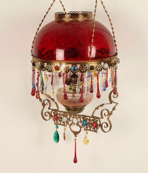 Ruby glass shade with cobalt and red hanging crystals. Brass metal construction. From the Larry Howard Estate.