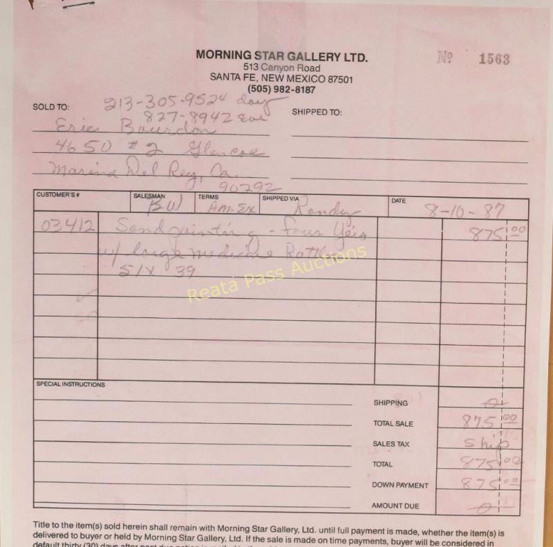 Entitled "Four Yeis with Medicine Rattles" purchased from the Morningstar Gallery Santa Fe, NM. Measures 44"x33", includes original receipt for $875. Nicely framed.