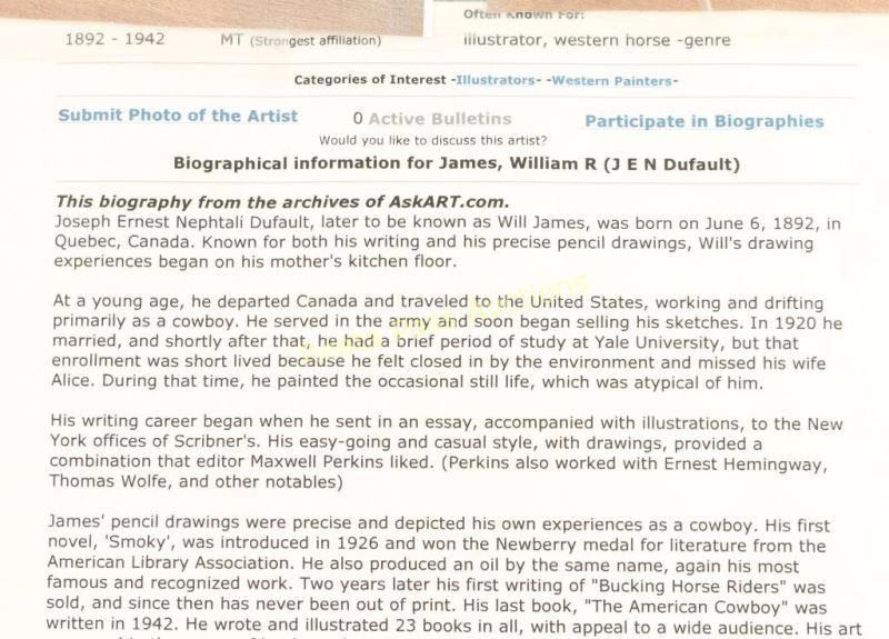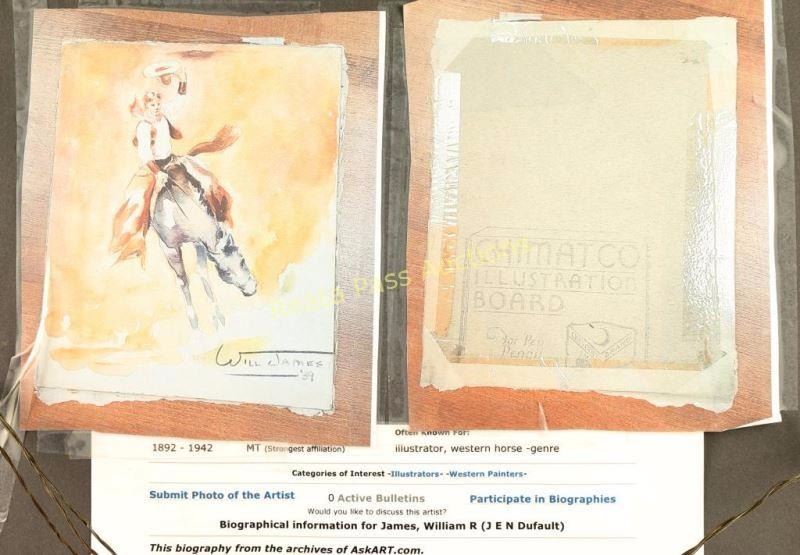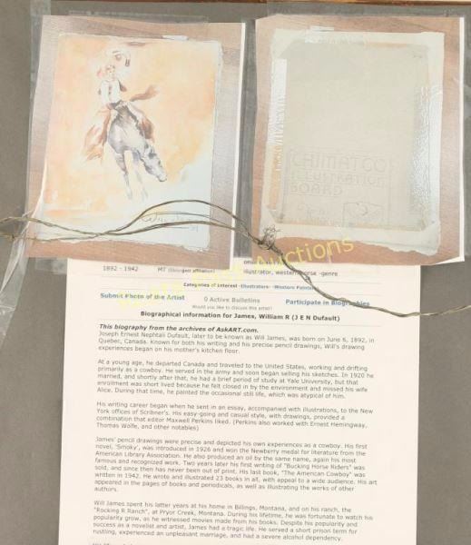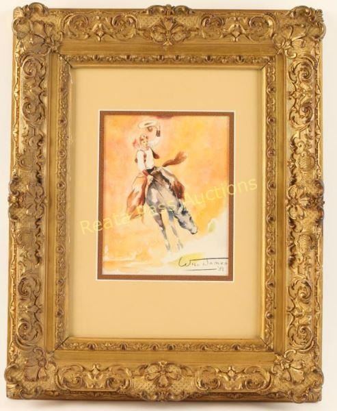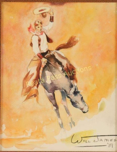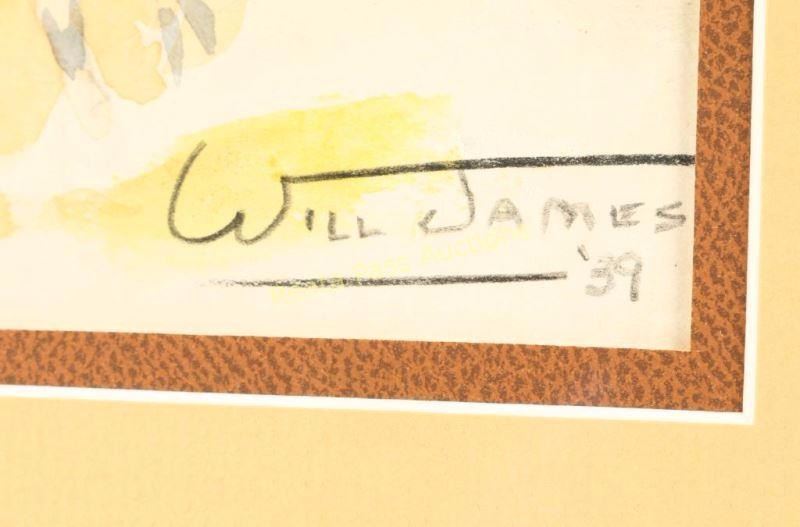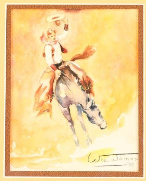 Depicting bronc rider. Image measures 6"x7 1/2". Double mat and molded gold frame. Signed lower right. Piece of art painted, dated '39, at least ten years after he rode his last bronc. Will James, cowboy, cattle rustler, and beloved author and artist of the American West, was born Joseph Ernest Dufault on June 6, 1892, at St. Nazaire de Acton in Quebec, Canada. He came West in 1907 at the age of fifteen, becoming a cowhand and changing his name to William Roderick James. James showed artistic talent from an early age, and gained a reputation for his sketches of life on the range long before publishing his first work. A turning point in James early life came in 1914, when he was accused of rustling cattle in Ely, Nevada and sentenced to the Nevada State Prison at Carson City for a year to fifteen months. During his prison term, he turned to his art for solace, and after his release he became one of the best known Western writers and artists. Between 1920 and his death in 1942, he wrote and illustrated more than twenty books and numerous magazine articles. ~Information provided courtesty of University of Nevada, Reno, Special Collections and University Archives~
